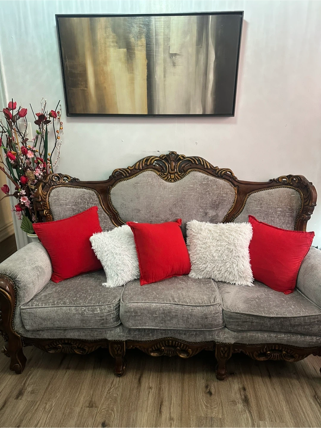 This beautiful sofa features a classic ornate wood frame with plush grey upholstery. It includes four decorative throw pillows: two red and two fluffy white. It's a stunning statement piece for any living room!