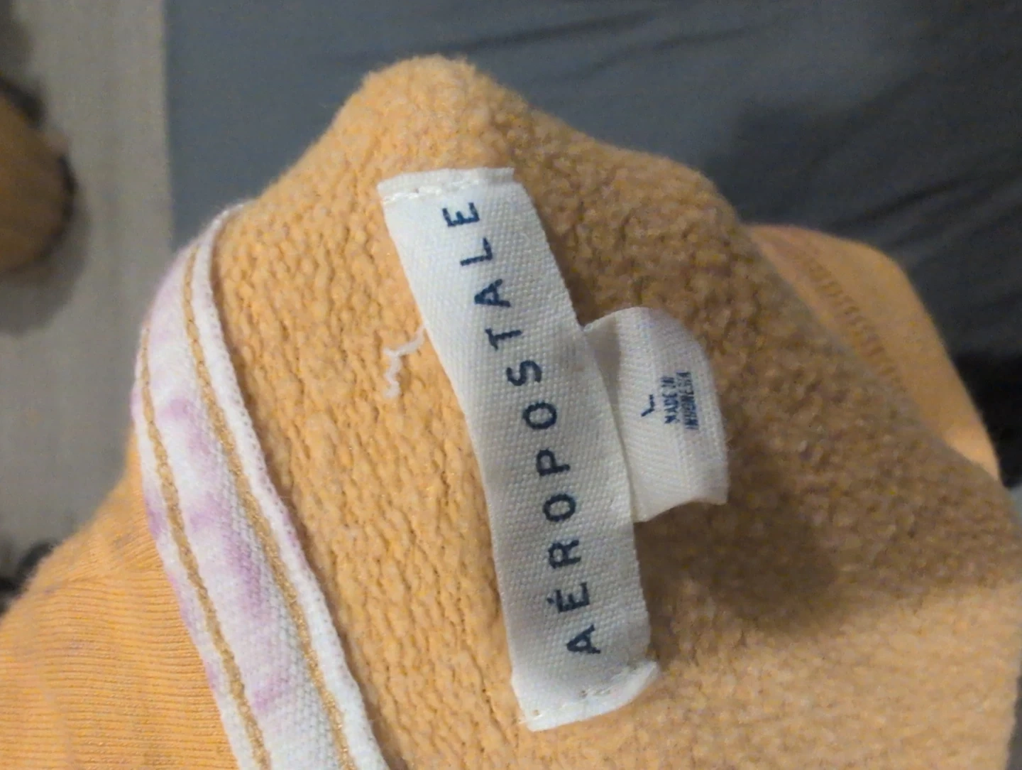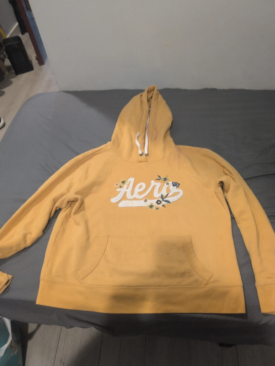 This is an AƩropostale orange hoodie sweatshirt. It's a size large and has a "Aero NY" graphic on the front with floral accents. Made in Indonesia.