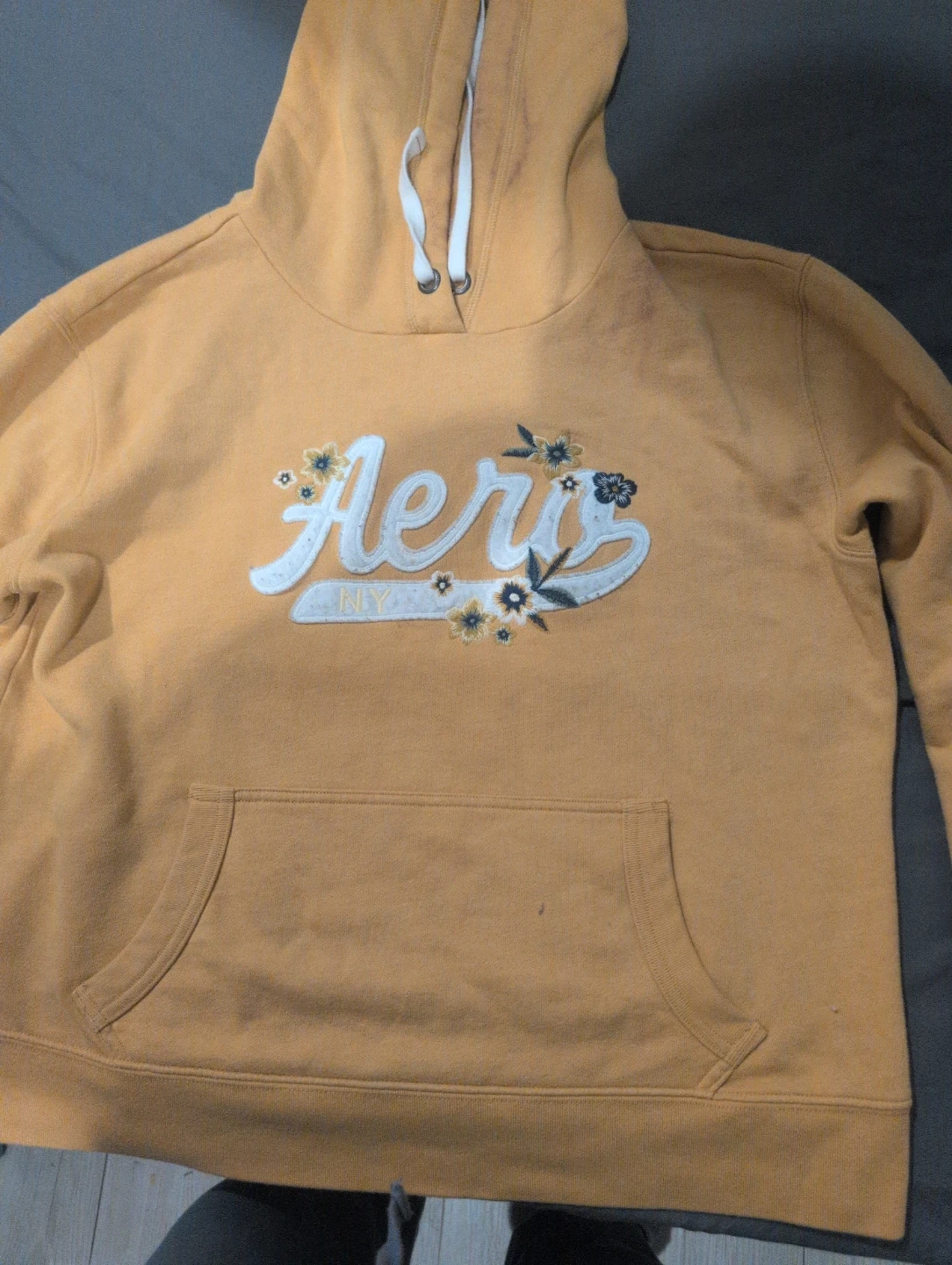 This is an AƩropostale orange hoodie sweatshirt. It's a size large and has a "Aero NY" graphic on the front with floral accents. Made in Indonesia.