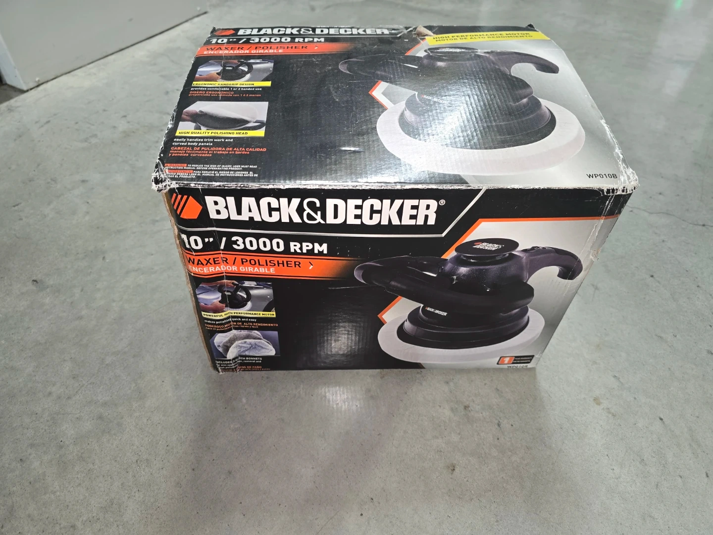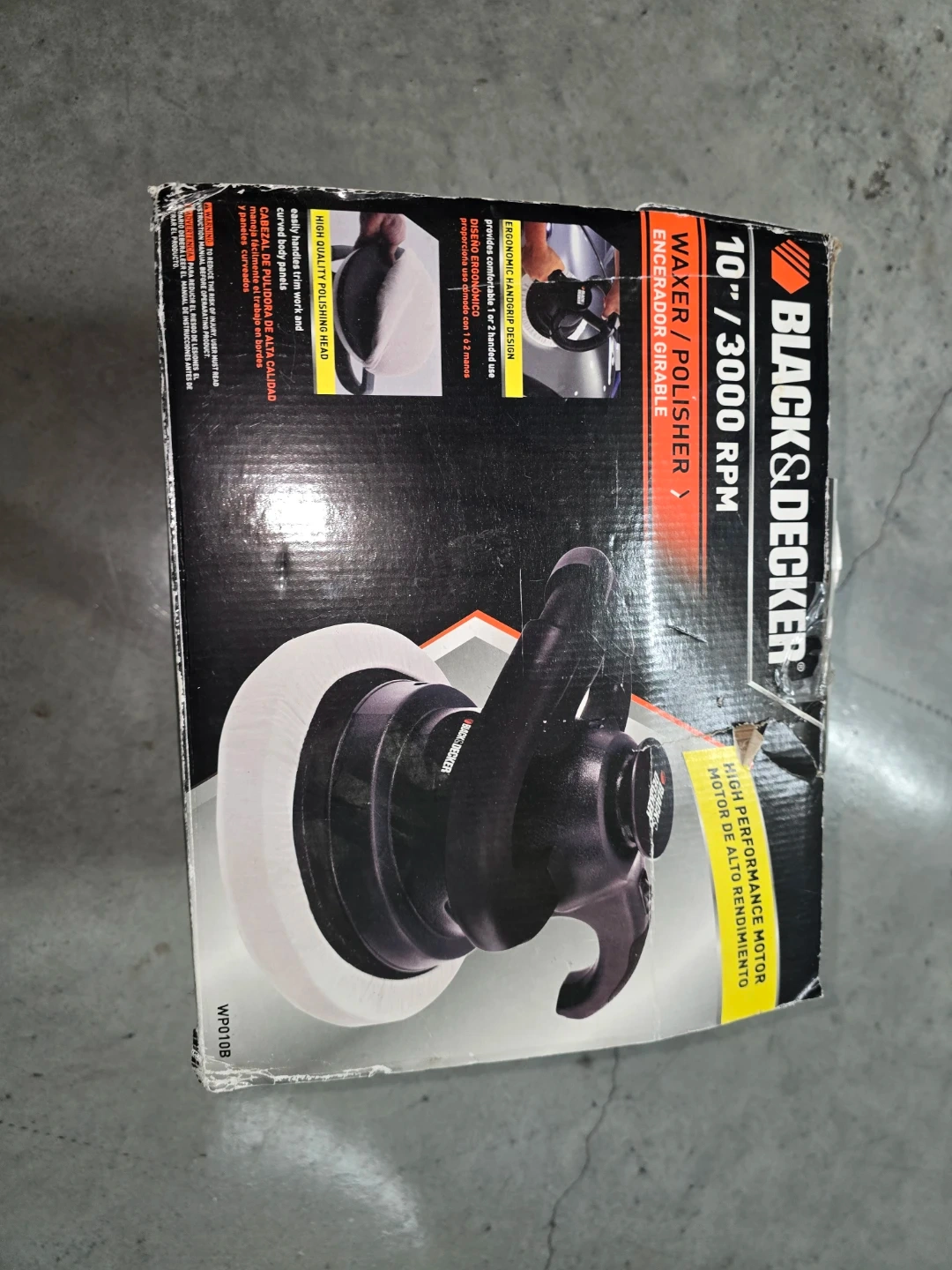 This is a BLACK+DECKER 10-inch waxer and polisher with a 3000 RPM motor. It features a high-performance motor and a random orbit action for a swirl-free finish. Includes a high-quality polishing head.