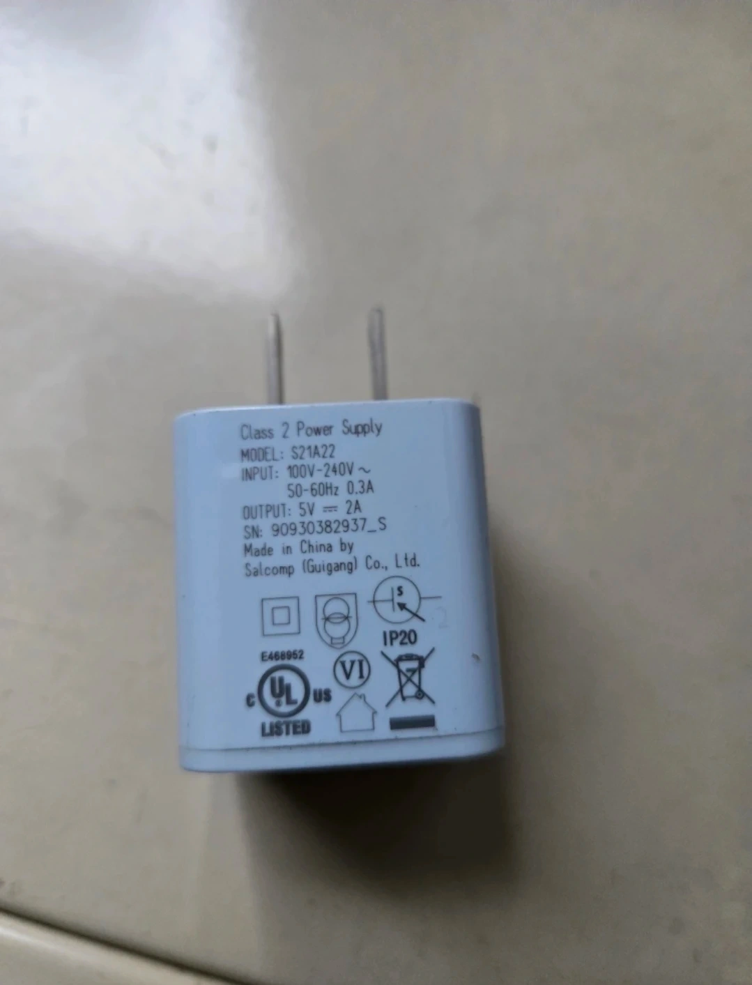 1000+Selling a Salcomp Class 2 Power Supply. The model number is S21A22. It supports an input of 100V-240V ~ 50-60Hz 0.3A and an output of 5V == 2A. Made in China by Salcomp (Guigang) Co., Ltd.