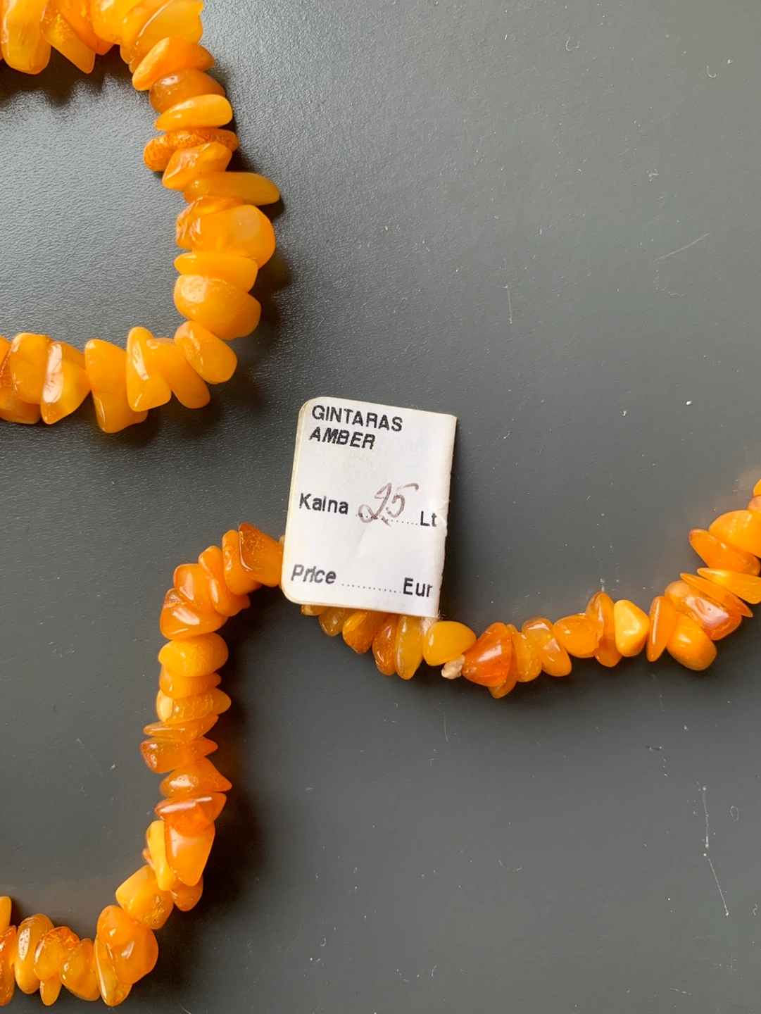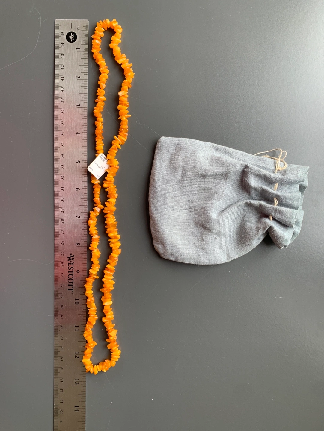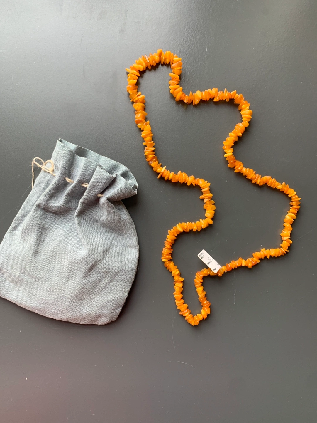 Genuine amber necklace. Irregularly shaped amber beads. Comes in a gray drawstring bag. Approximately 26 inches long. No clasp. Authentic from Estonia