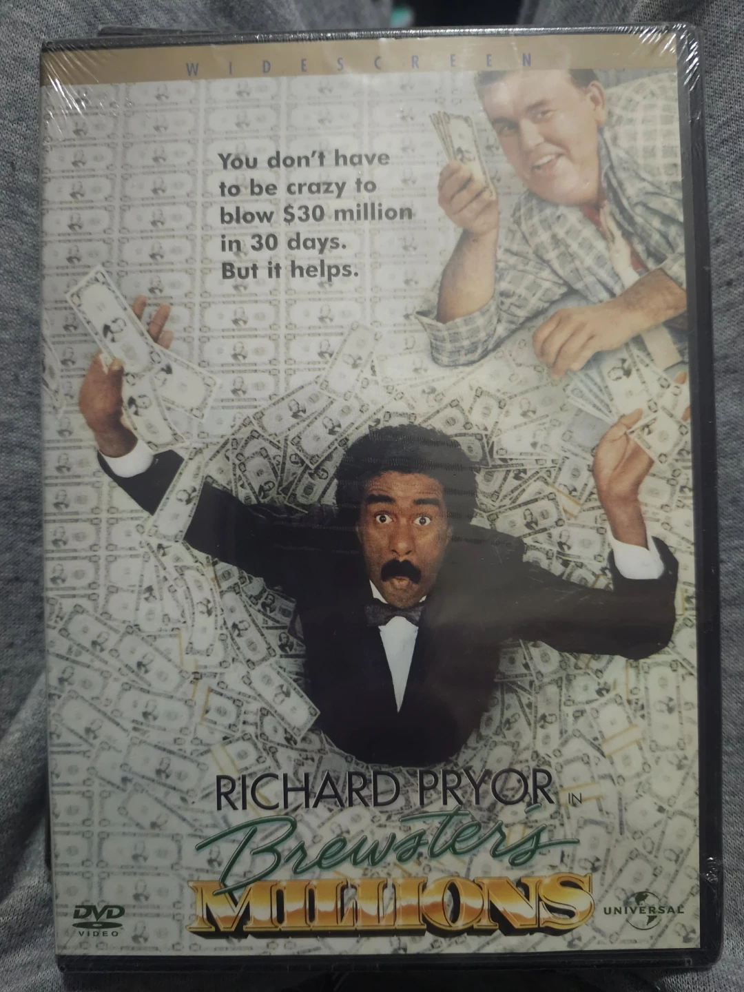 This is the movie Brewster's Millions starring Richard Pryor. It's a DVD with a widescreen presentation. The film's tagline is 'You don't have to be crazy to blow $30 million in 30 days. But it helps.'