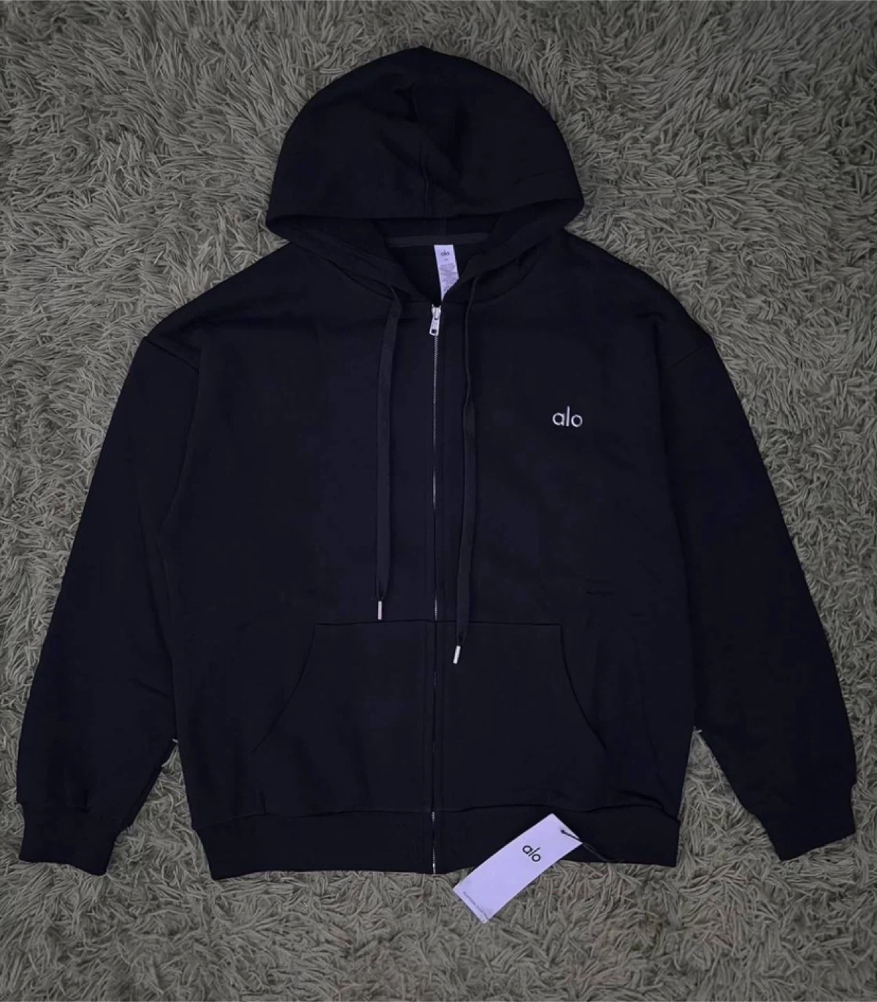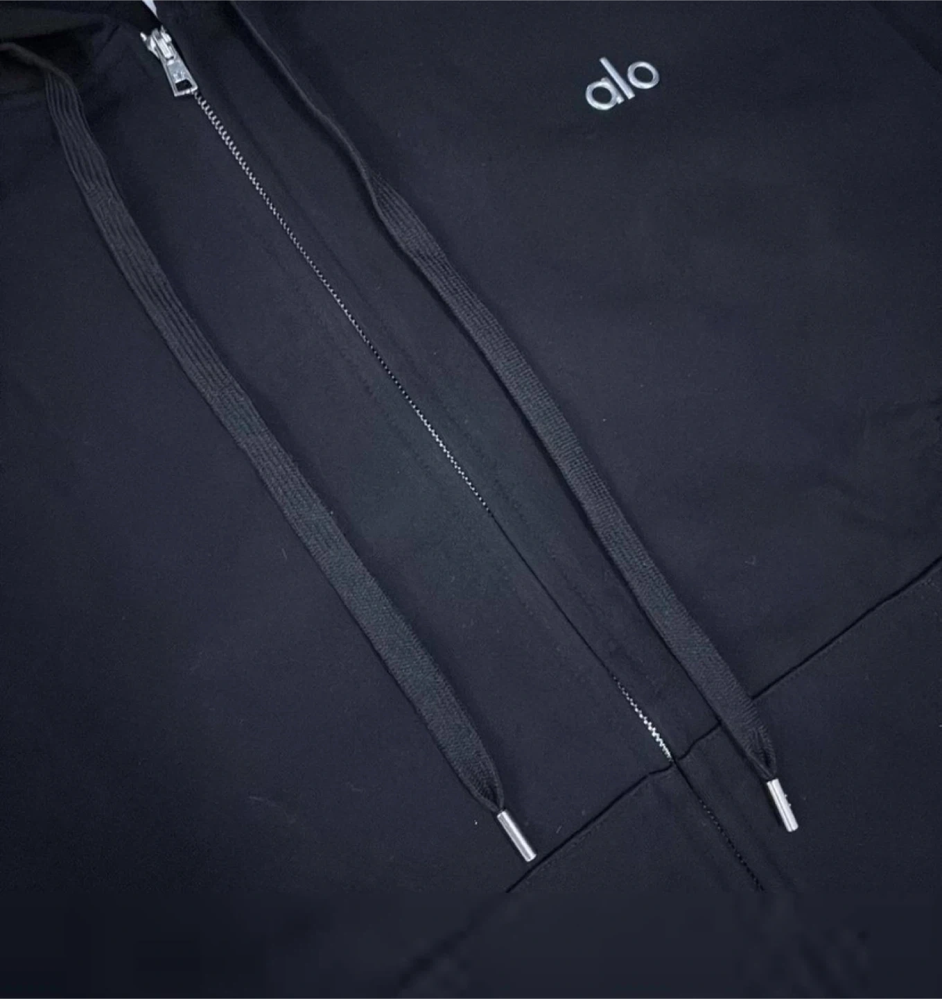 Sleek Black Colorway Featuring The Signature Alo Chest Logo, Full Front Zip Closure, Adjustable Drawstrings, And Soft Premium Fabric For Everyday Comfort And Clean Minimal Style.