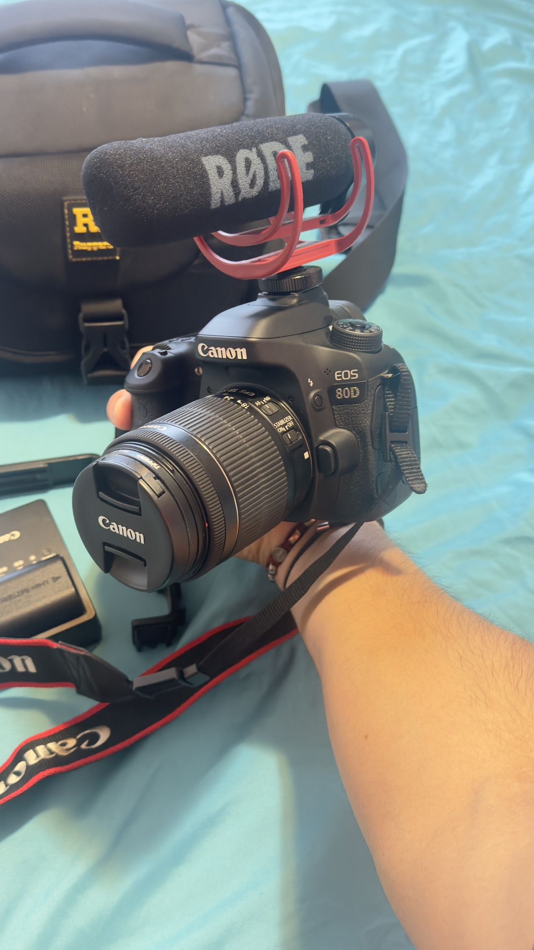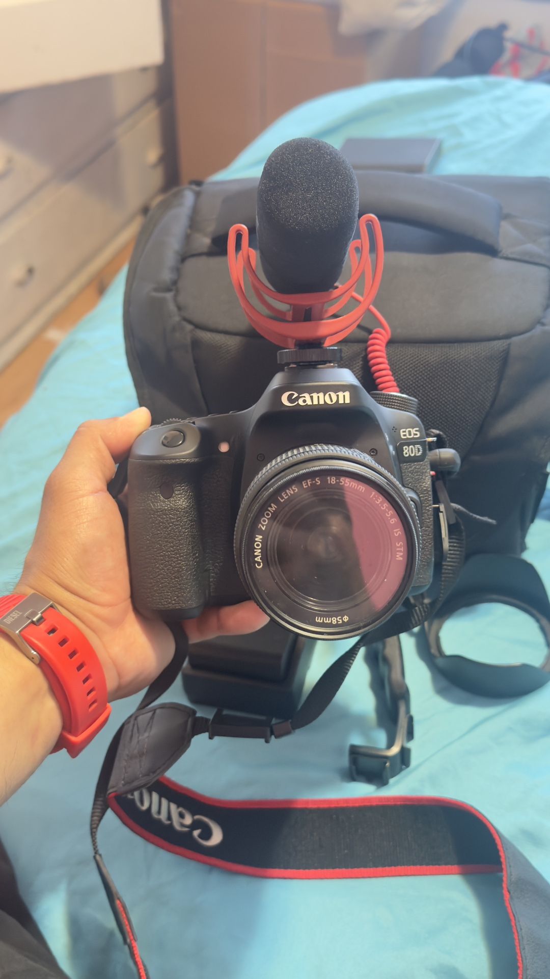 The camera is in perfect condition, almost new. I honestly haven't used it. I want someone to put it to better use. I'll give it to you with a bag, two batteries, a Rode microphone, a handheld stand, and an 18-55mm lens.