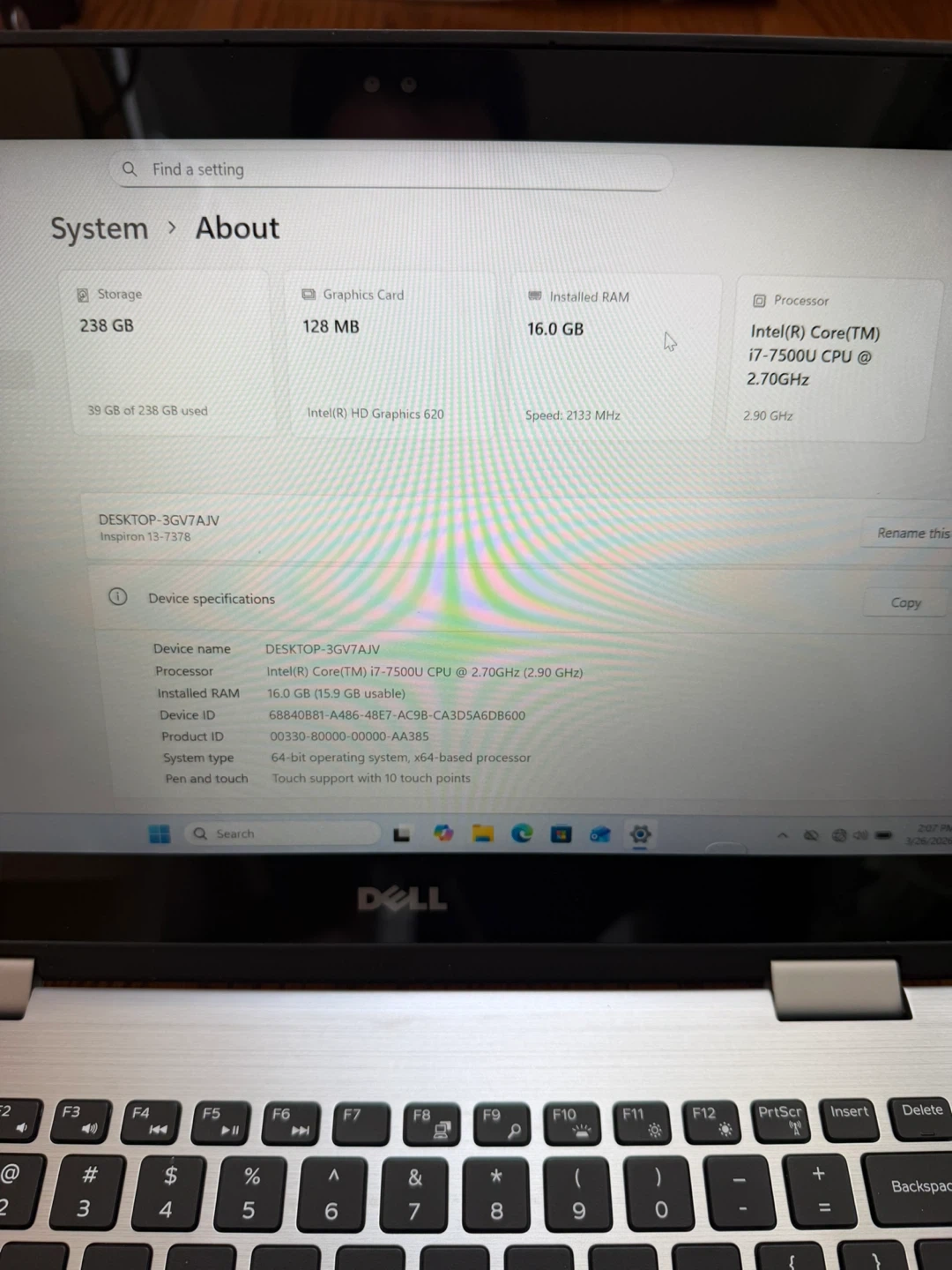 Dell Inspiron 13 2-in-1 laptop with Intel Core i7-7500U processor, 16GB RAM, and 256GB storage. It has a 13-inch touchscreen display and includes the power adapter. This versatile laptop is ready for your daily tasks!