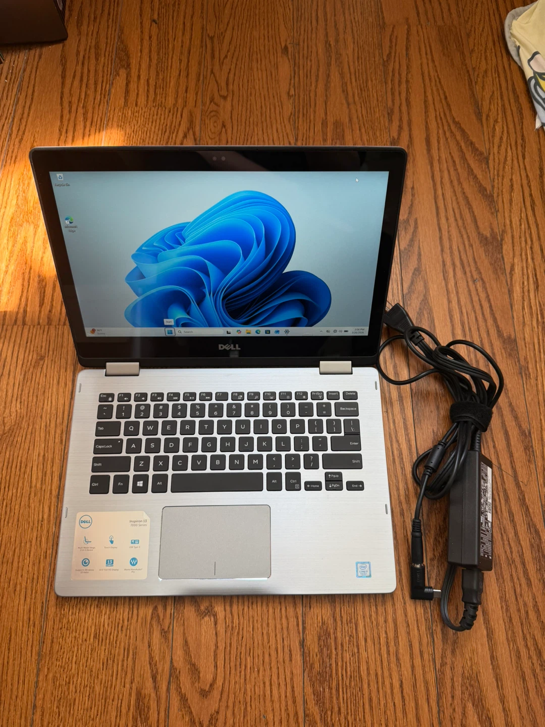 Dell Inspiron 13 2-in-1 laptop with Intel Core i7-7500U processor, 16GB RAM, and 256GB storage. It has a 13-inch touchscreen display and includes the power adapter. This versatile laptop is ready for your daily tasks!
