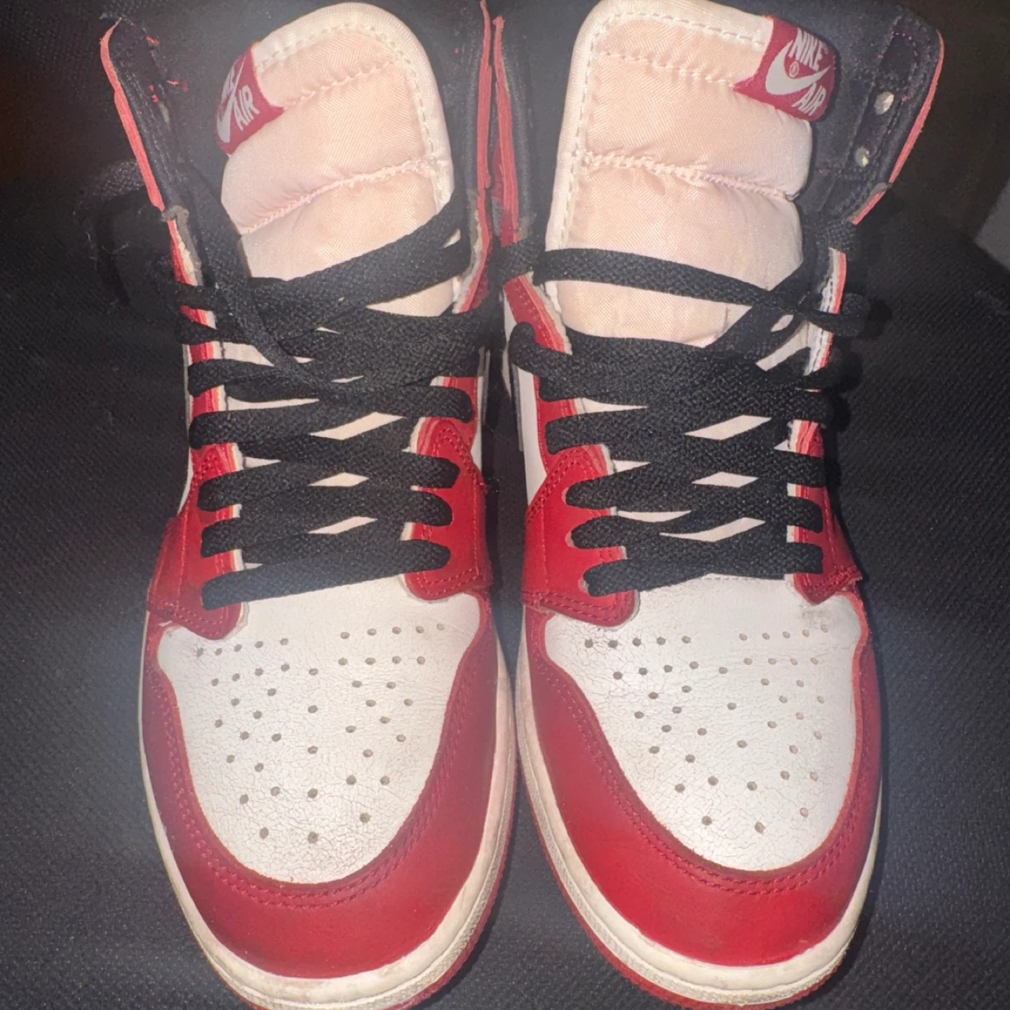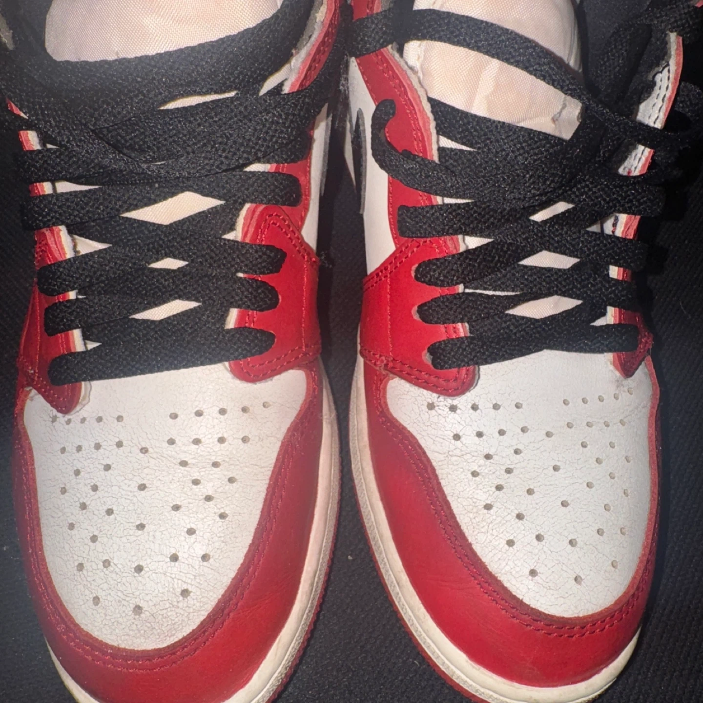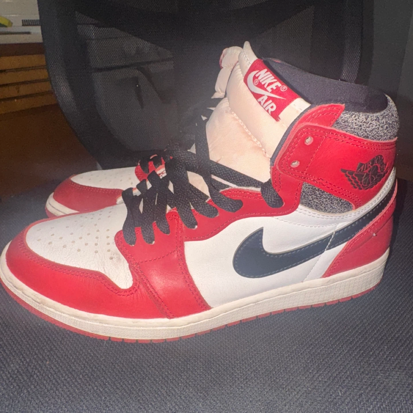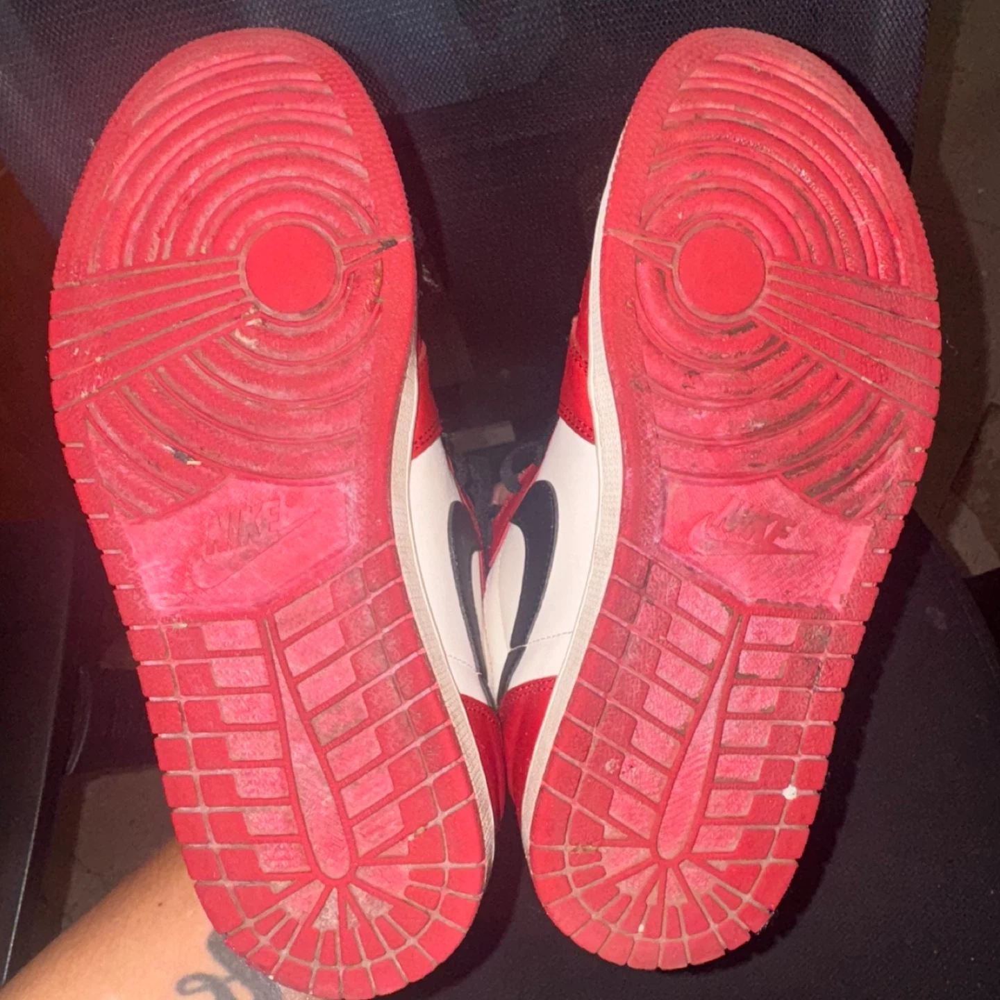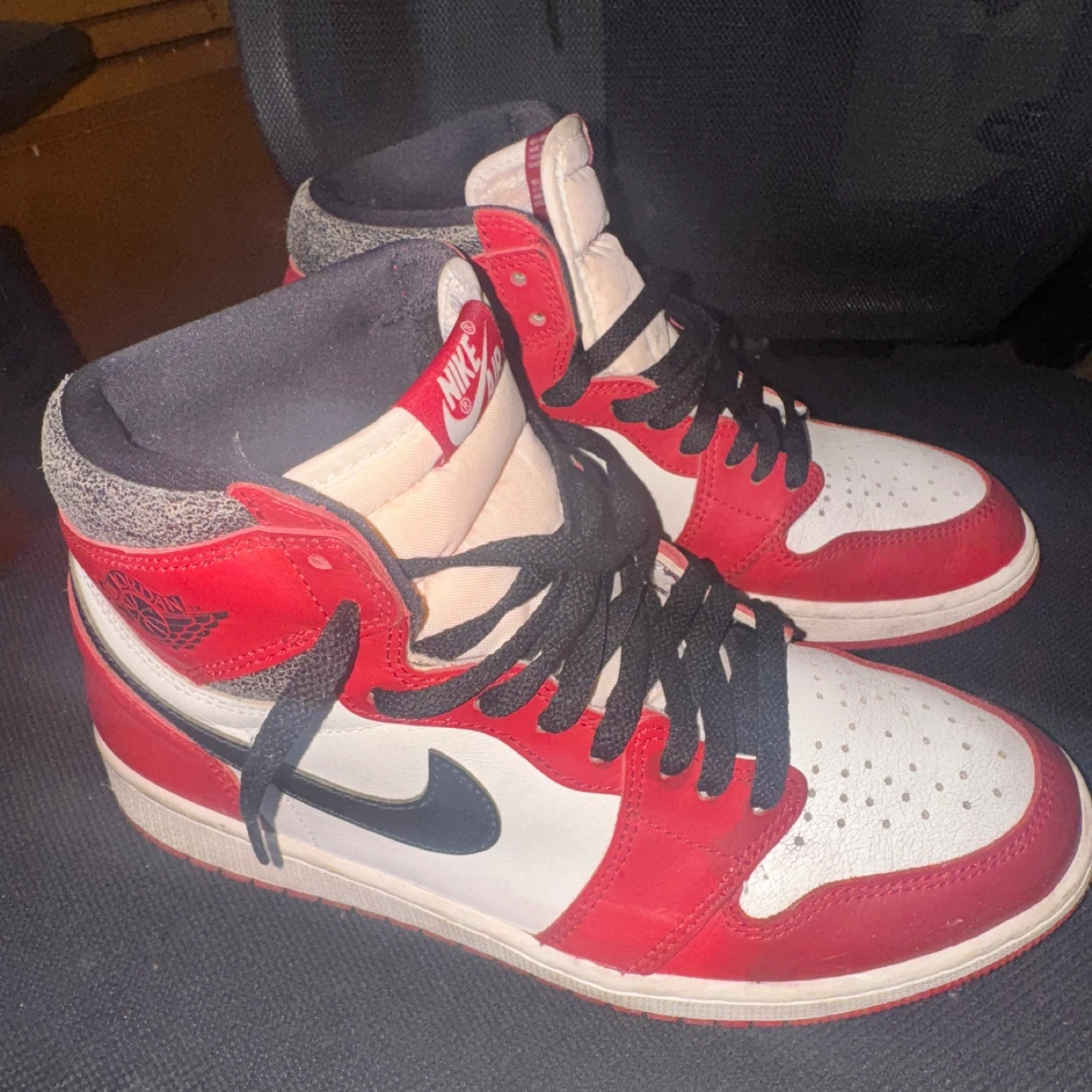These are Nike Air Jordan 1 high-top sneakers in a red, white, and black Perfect for sneaker collectors and fans! Lost and found 9.5