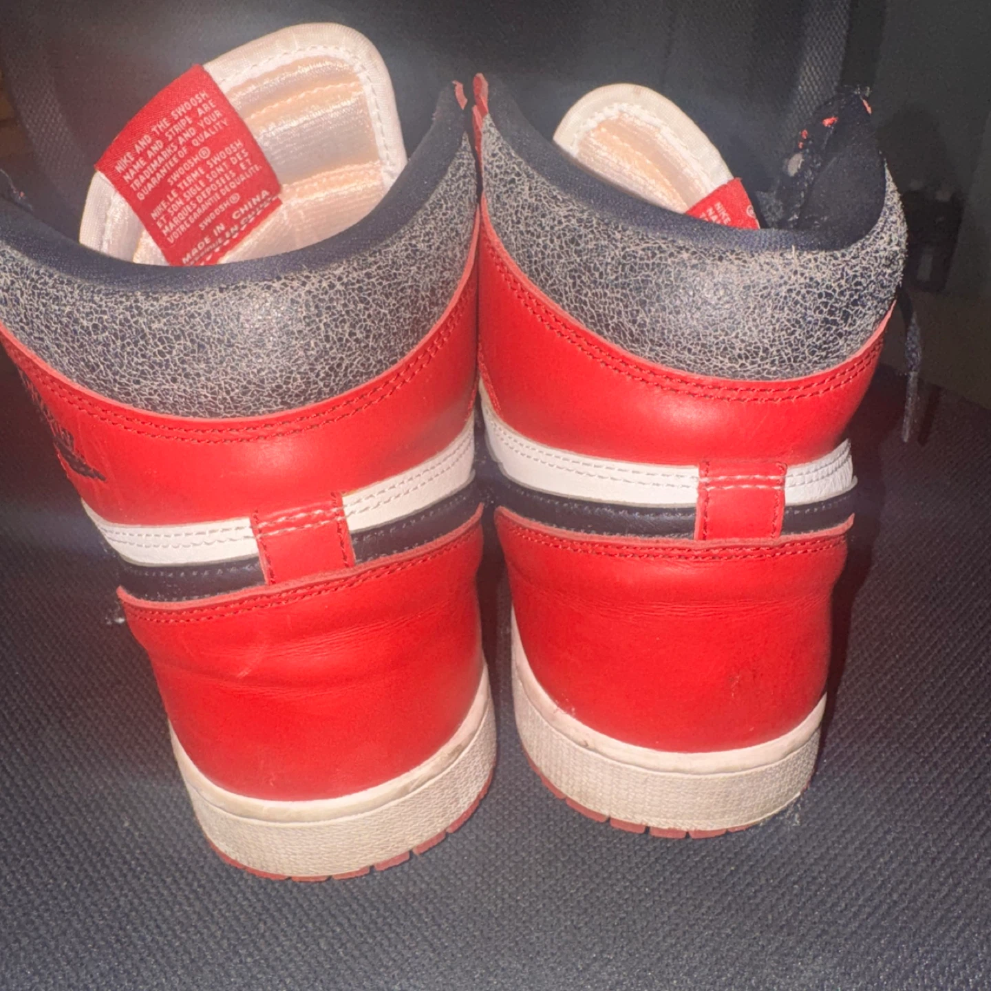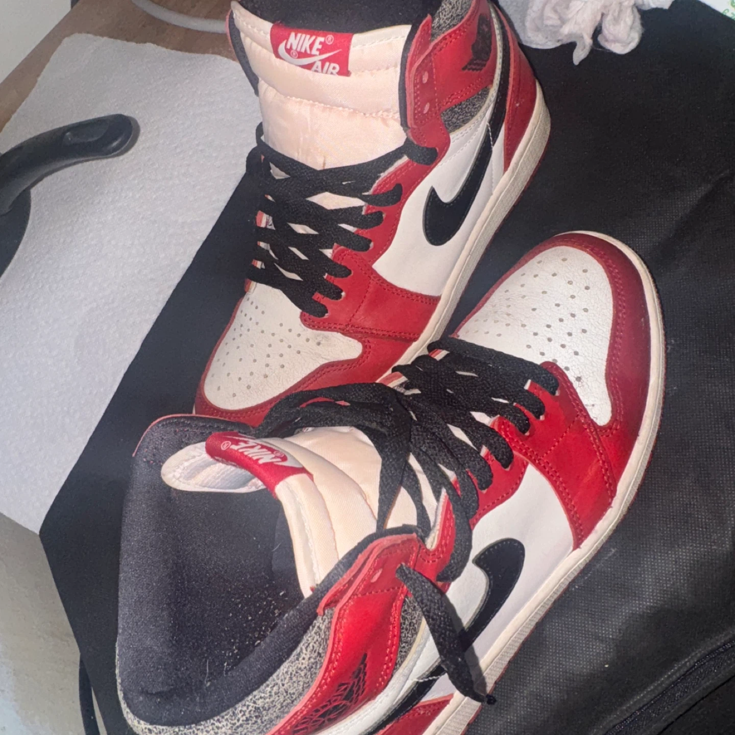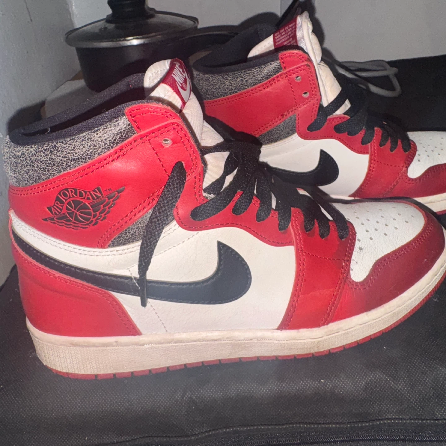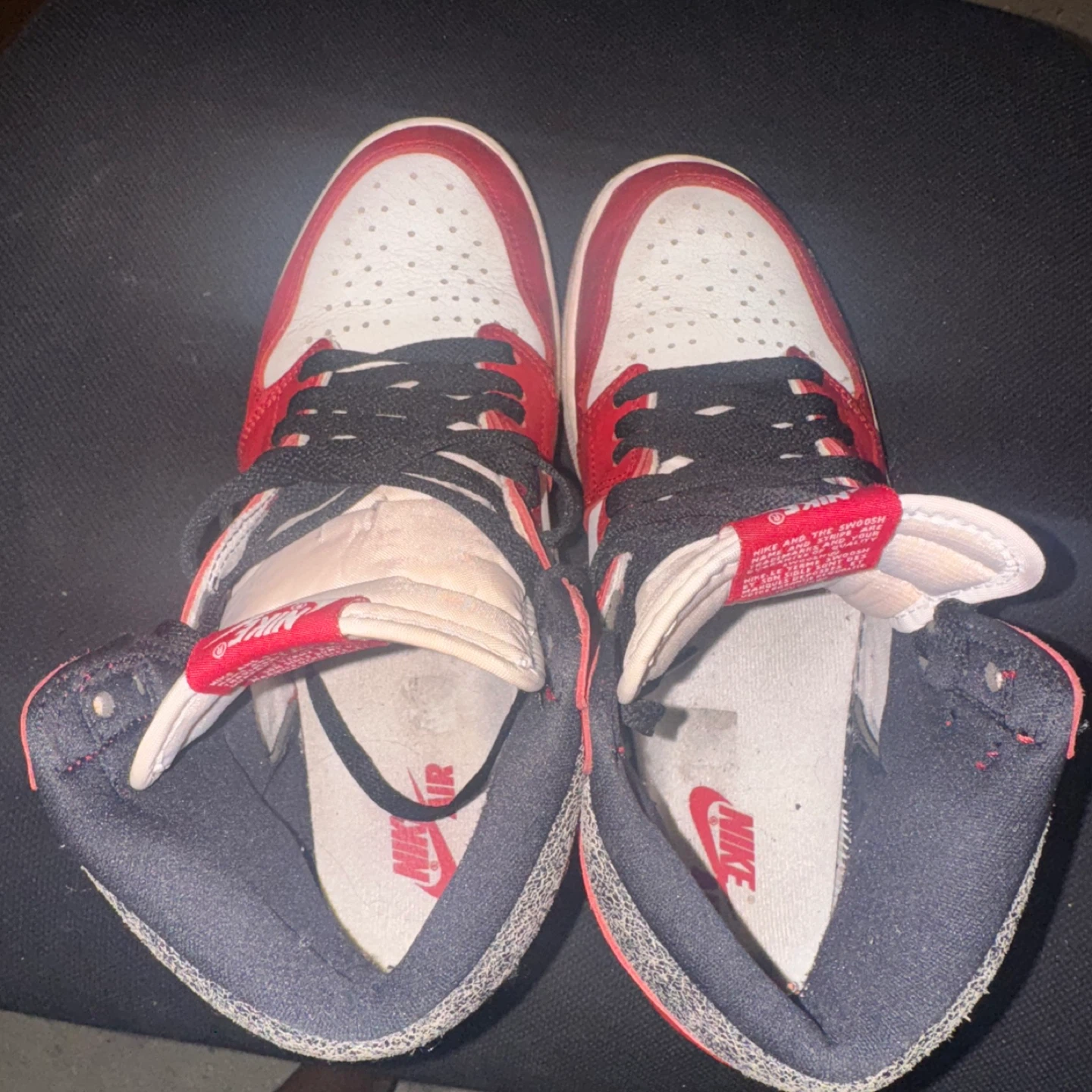 These are Nike Air Jordan 1 high-top sneakers in a red, white, and black Perfect for sneaker collectors and fans! Lost and found 9.5