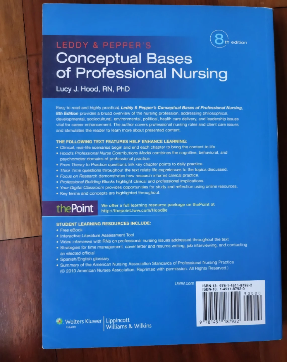 This is the 8th edition of Leddy & Pepper's Conceptual Bases of Professional Nursing, authored by Lucy J. Hood. It covers essential nursing concepts and includes online resources through thePoint. The book features case scenarios, review questions, and summaries.