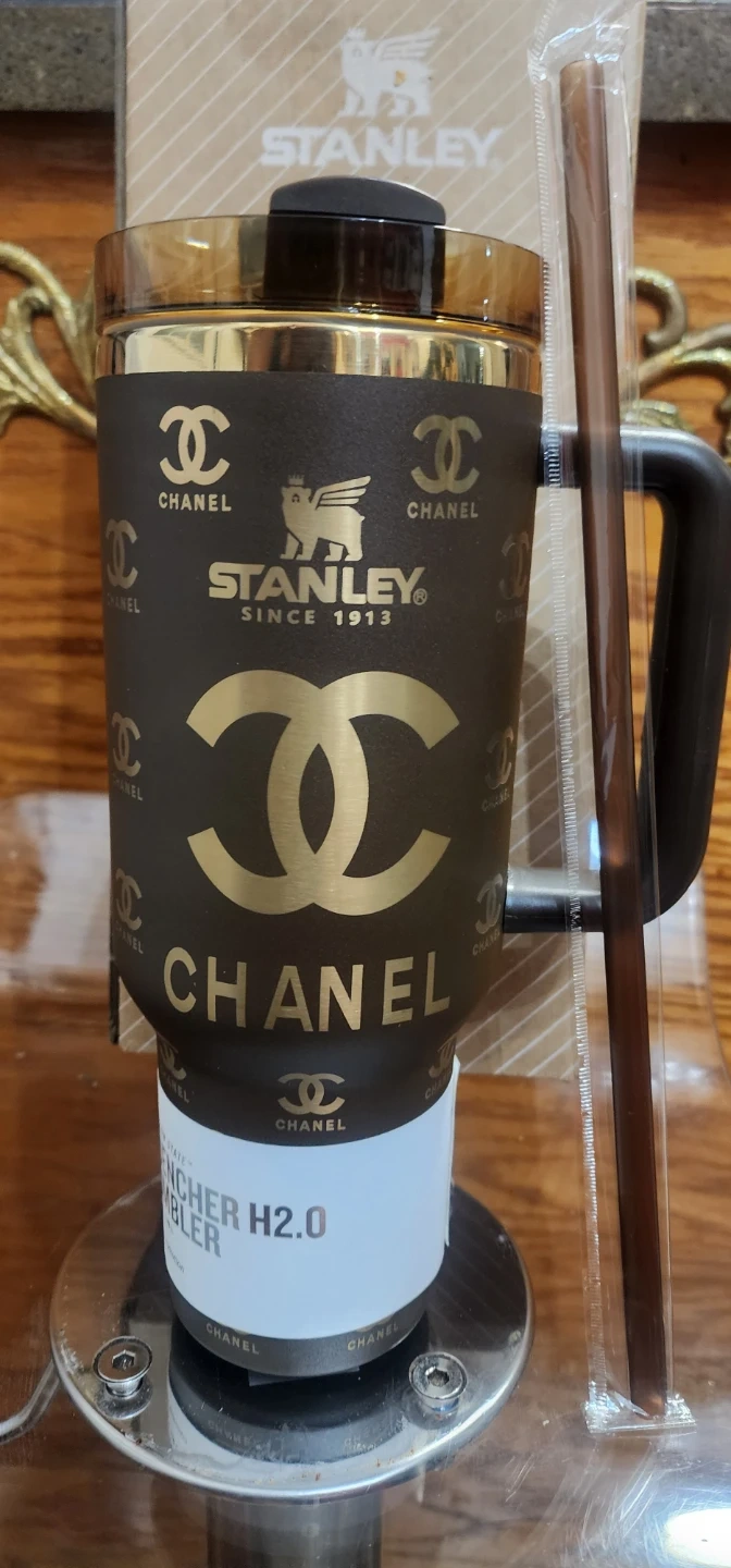 Stanley H2.0 tumbler featuring a Chanel print. Includes original straw. Vacuum insulated stainless steel construction.