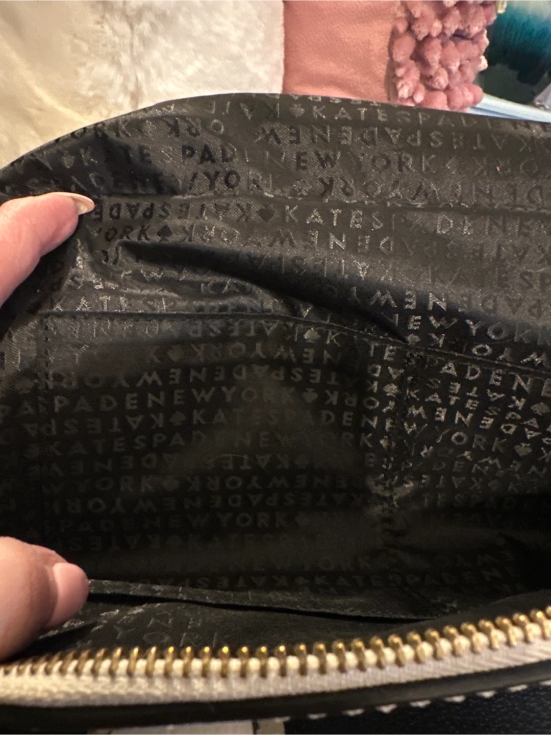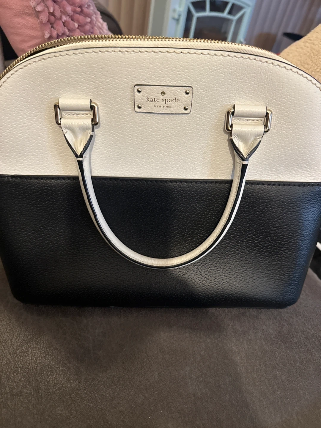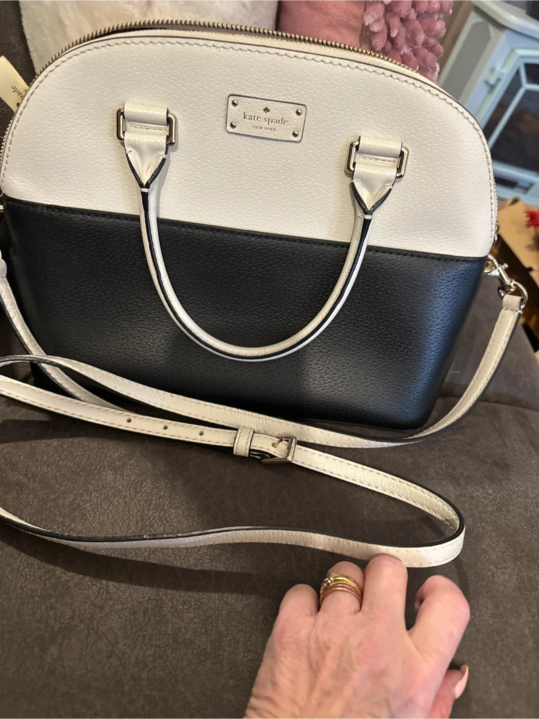 This is a Kate Spade New York dome satchel handbag. It's black and white with a leather exterior. It includes a detachable shoulder strap.