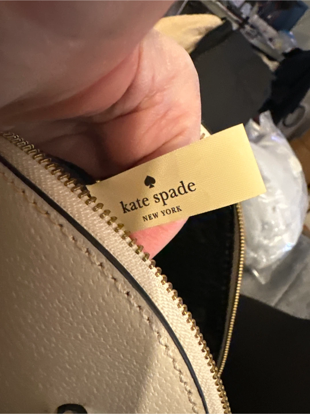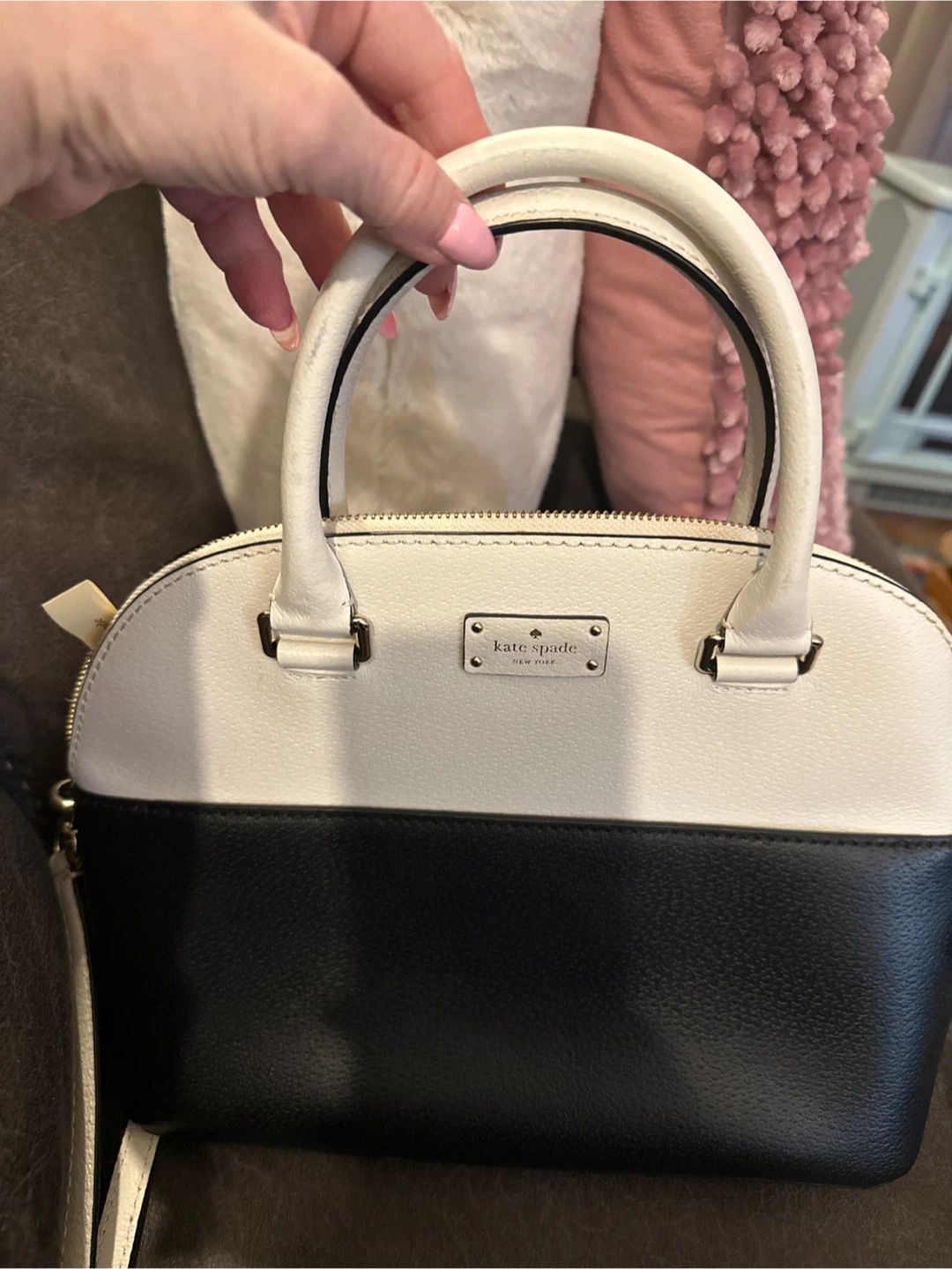 This is a Kate Spade New York dome satchel handbag. It's black and white with a leather exterior. It includes a detachable shoulder strap.