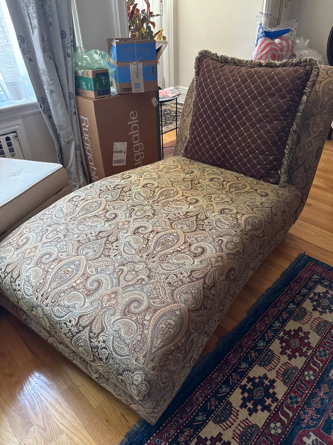 Selling a comfortable chaise lounge with a unique paisley pattern. It comes with a brown cushion for added comfort. The chaise lounge measures approximately 51 inches in length and 23 inches in height, making it a great addition to any living space