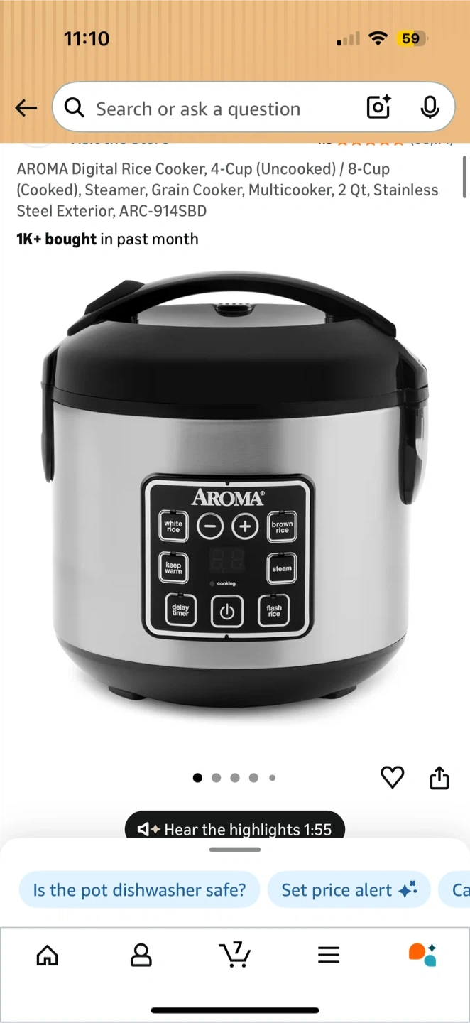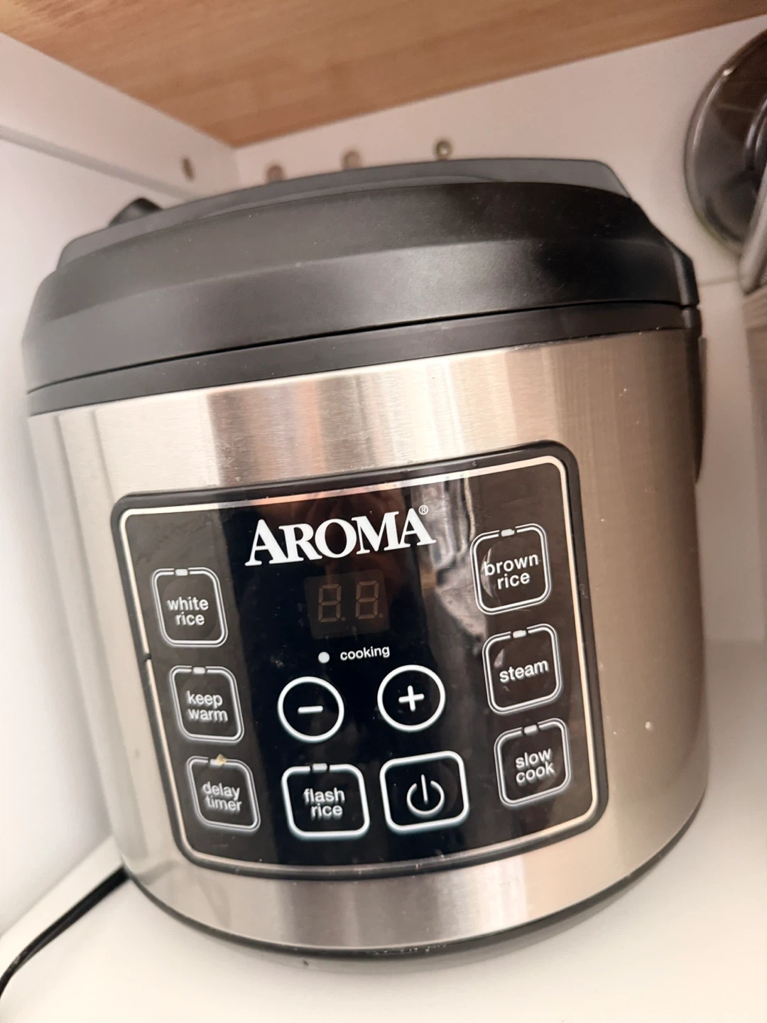 This Aroma digital rice cooker has multiple settings including white rice, brown rice, steam, and slow cook. It also includes a keep warm function and delay timer. Stainless steel exterior. Used lightly for about half a year. Selling because we don’t use it enough. Originally bought for $45 and is out of stock on Amazon currently.