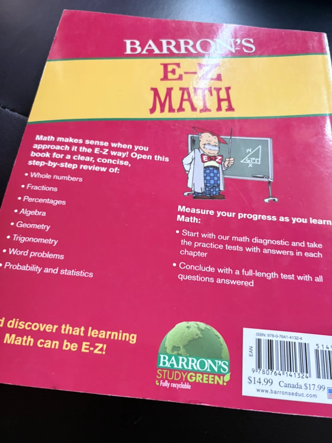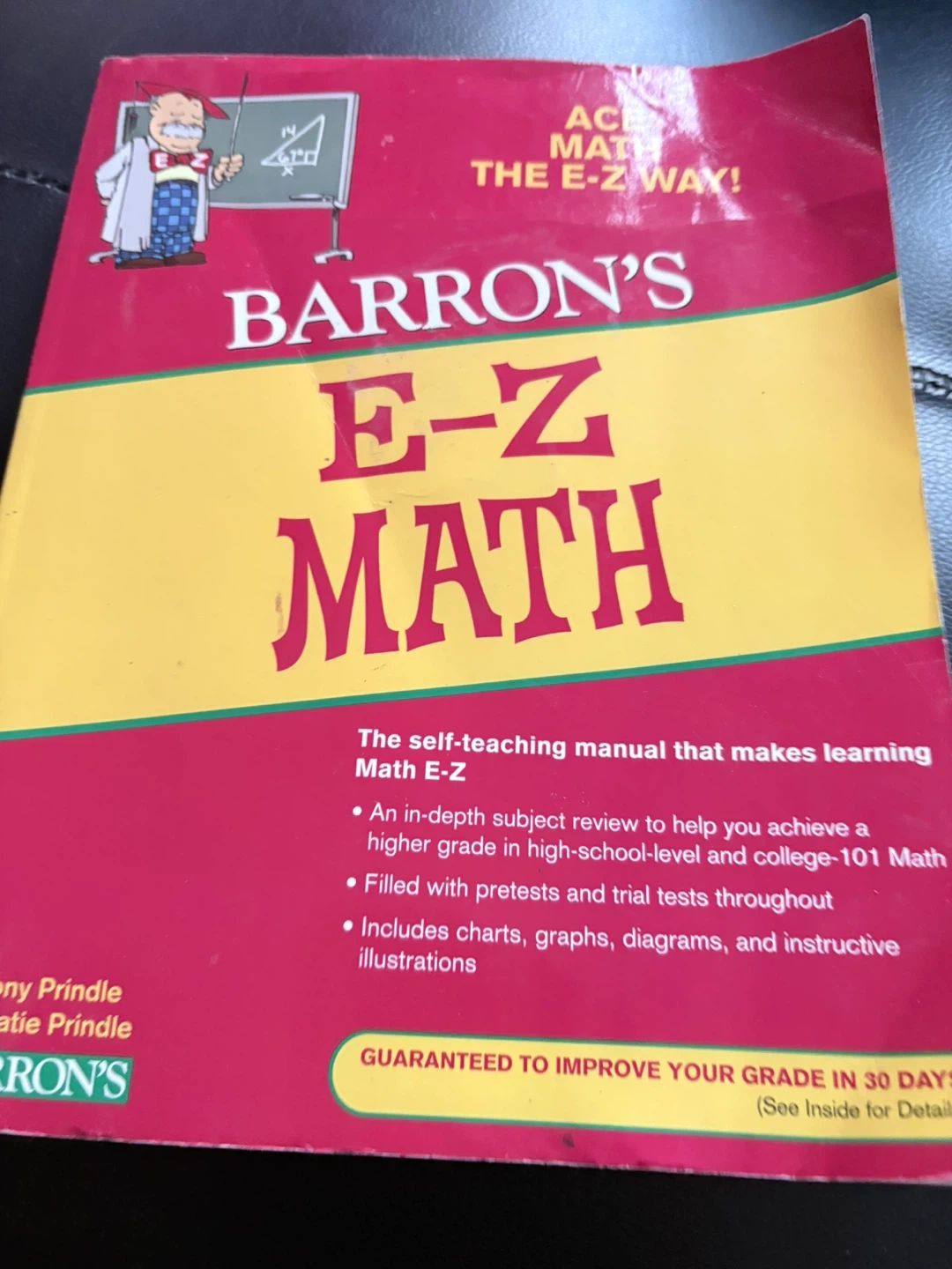 This is Barron's E-Z Math self-teaching manual. It covers whole numbers, fractions, percentages, algebra, geometry, trigonometry, word problems, and probability/statistics. It includes pretests, trial tests, charts, graphs, diagrams, and illustrations.