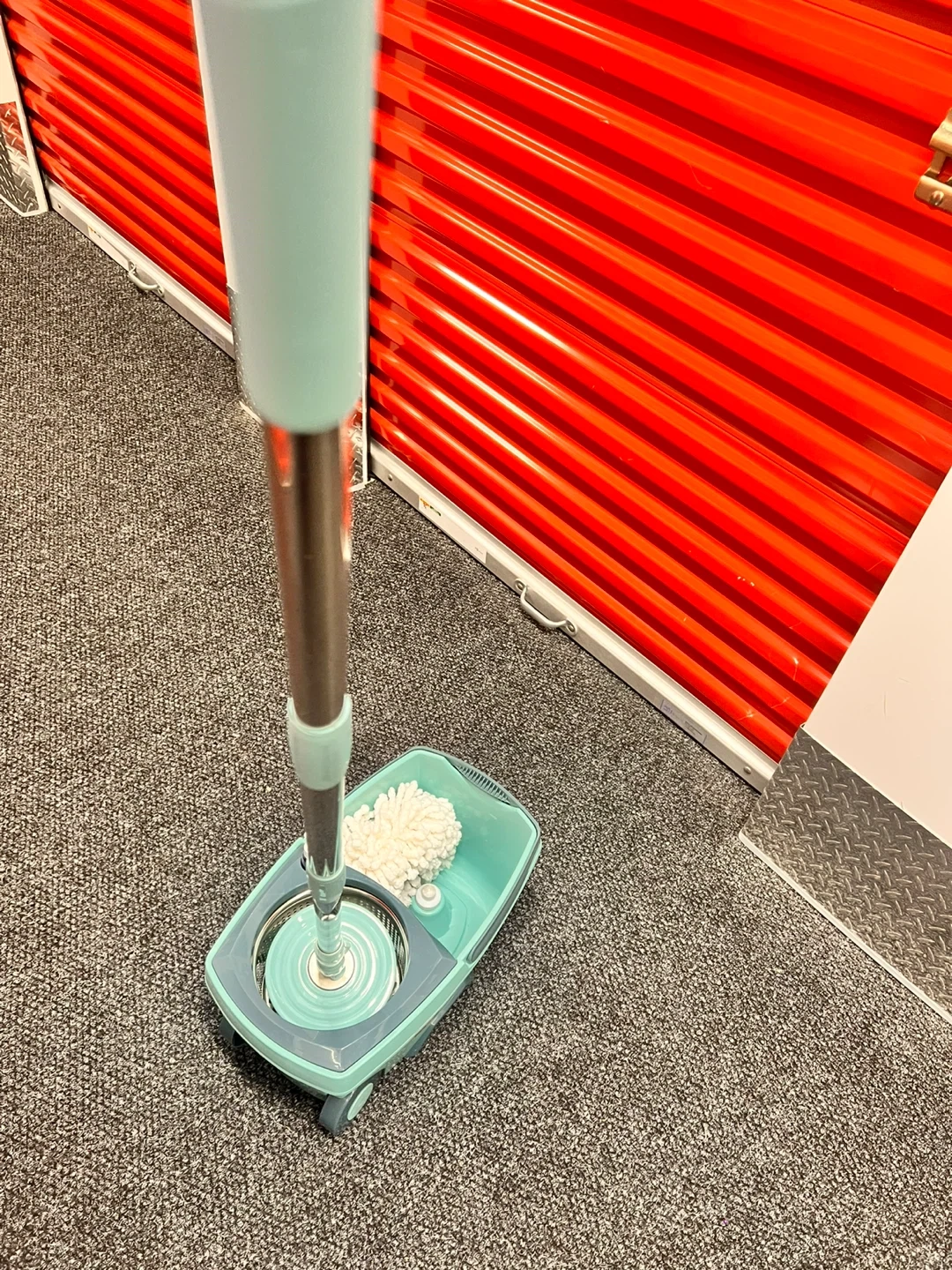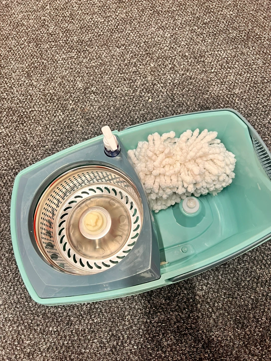 This is a spin mop system in teal and gray. It comes with one mop head and a bucket with a spinner. It has wheels for easy transport. This mop system makes cleaning floors simple!