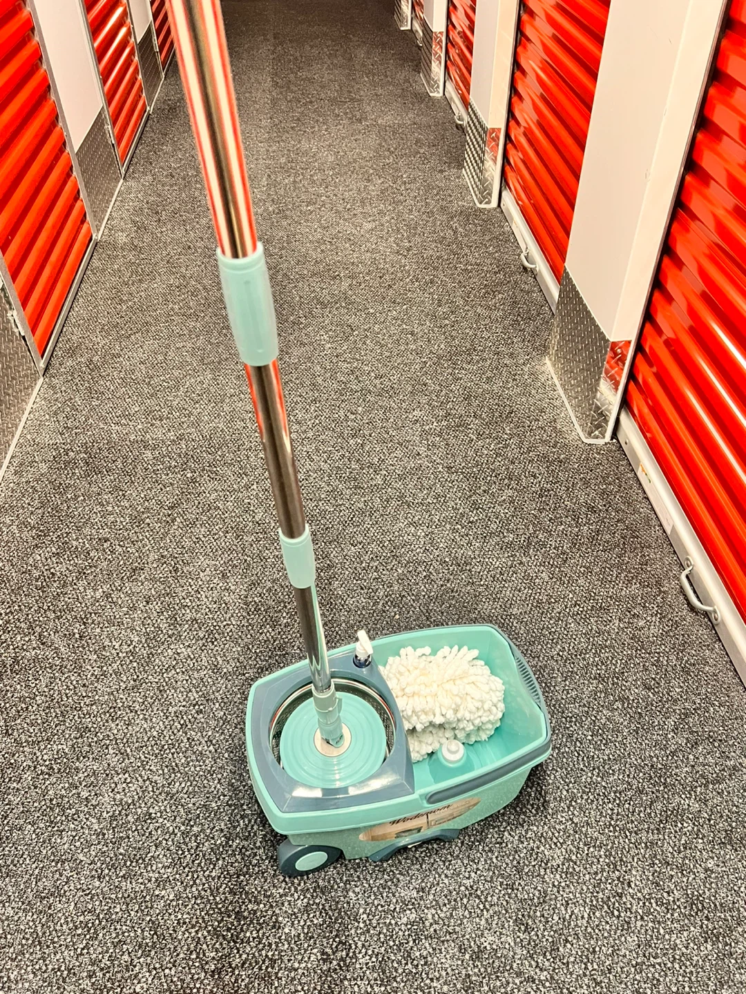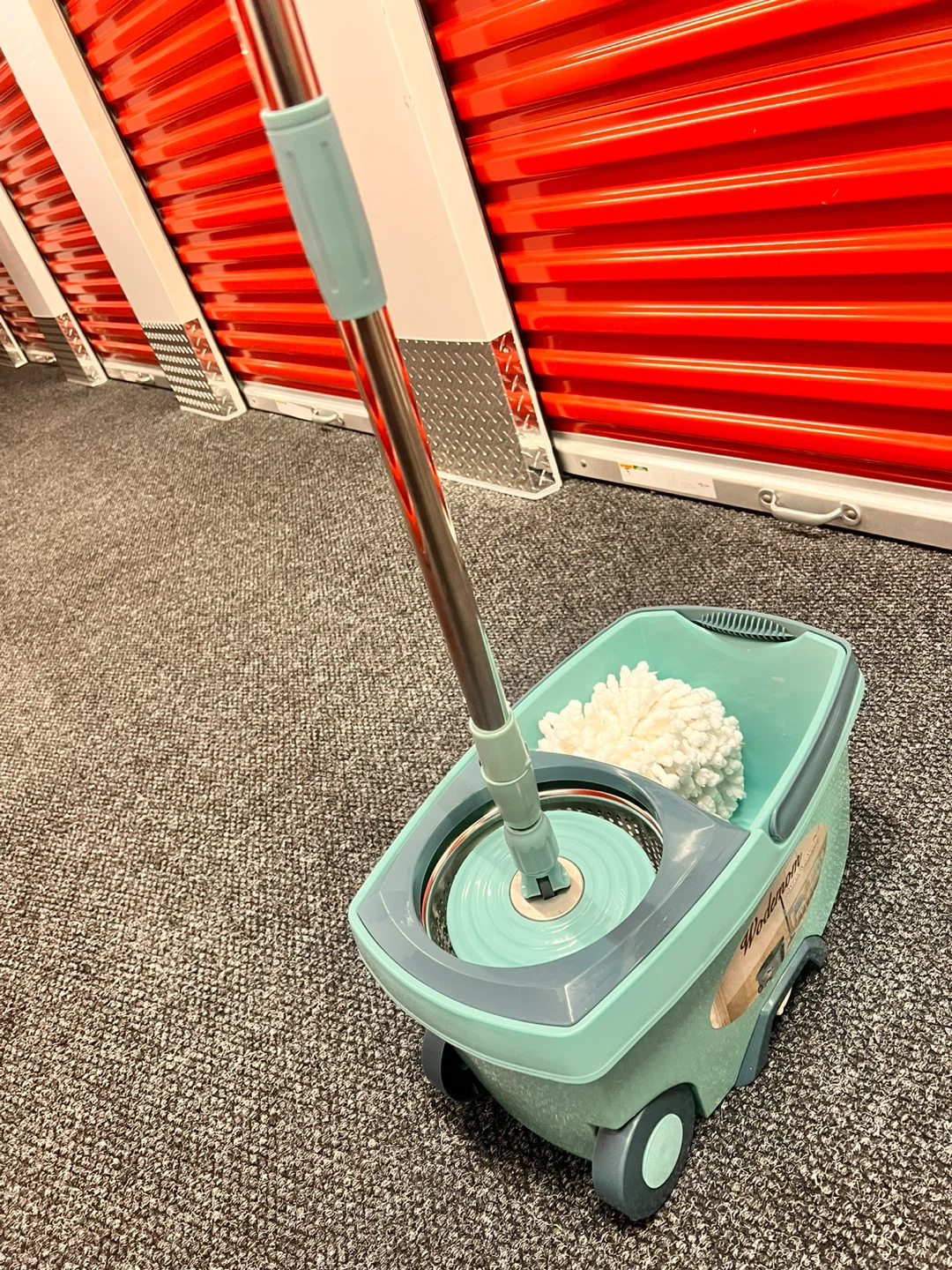 This is a spin mop system in teal and gray. It comes with one mop head and a bucket with a spinner. It has wheels for easy transport. This mop system makes cleaning floors simple!
