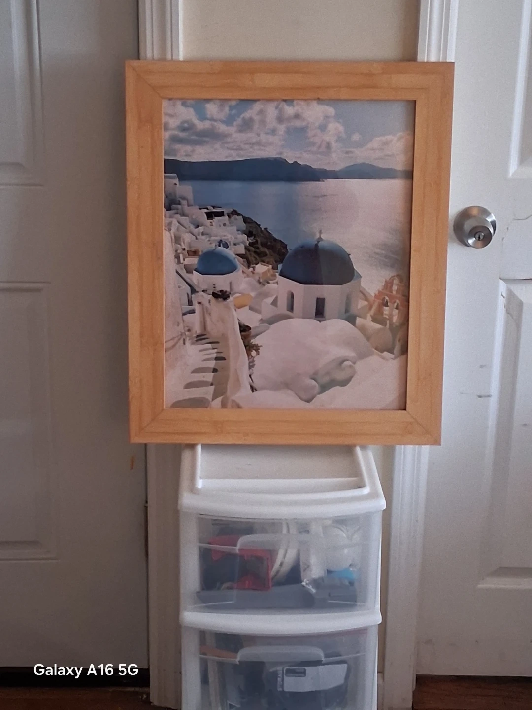 Wooden framed print featuring a scenic view of Santorini, Greece, with whitewashed buildings and blue domes. This piece adds a touch of Mediterranean charm to any room. Ready to hang.