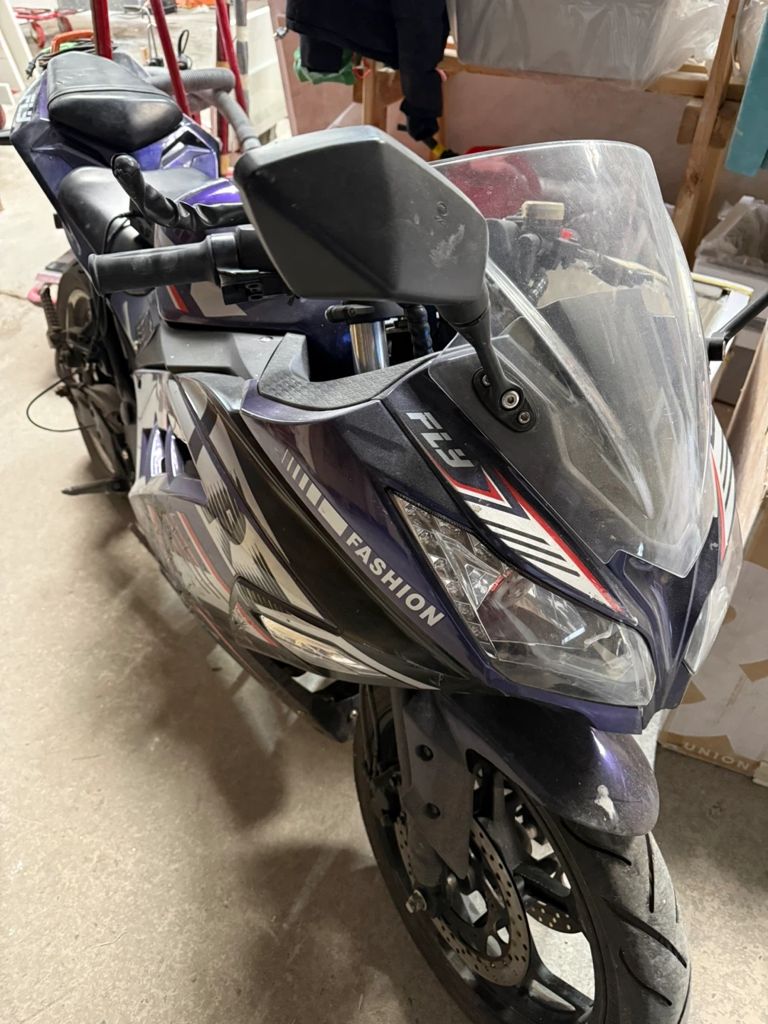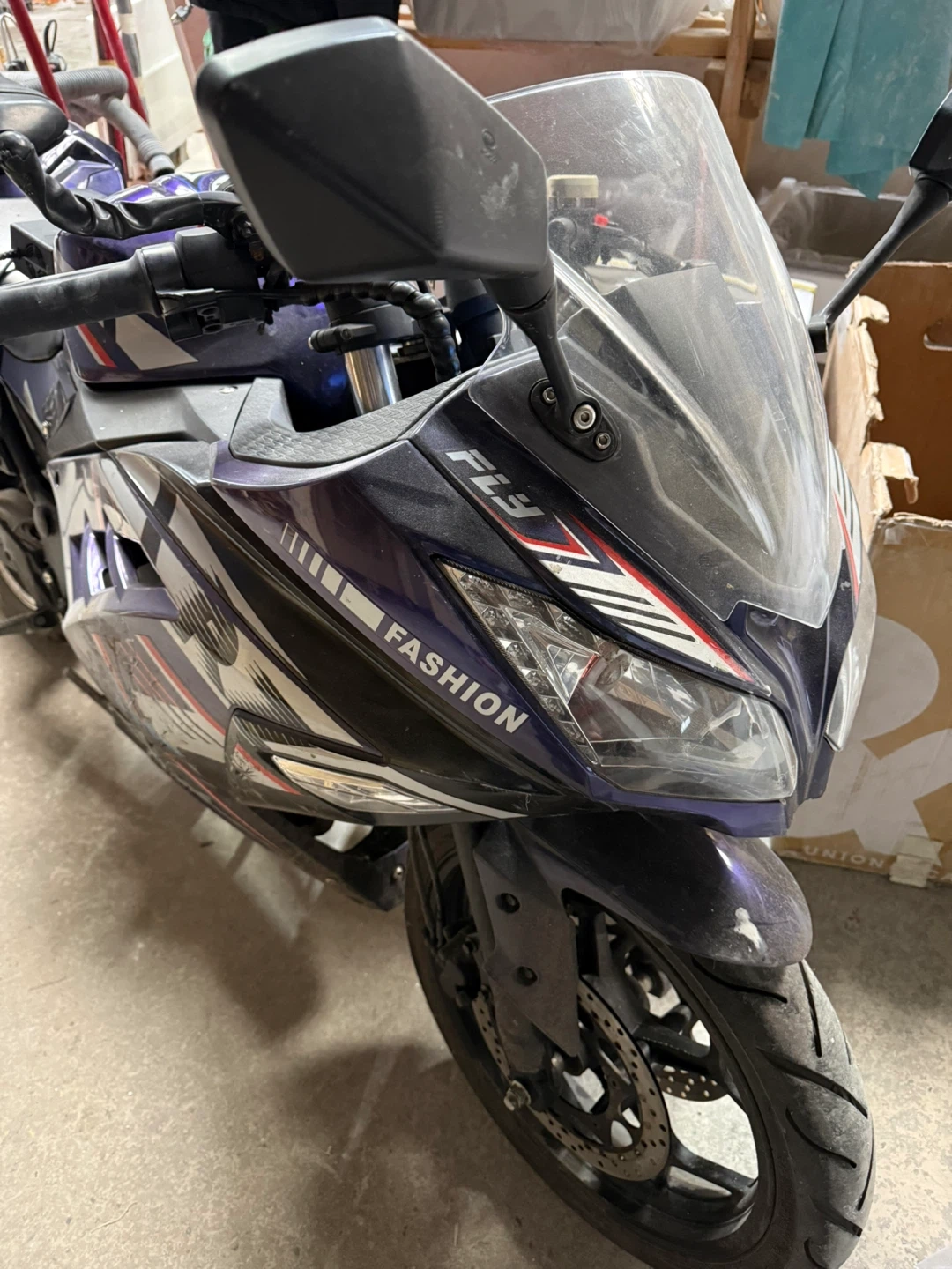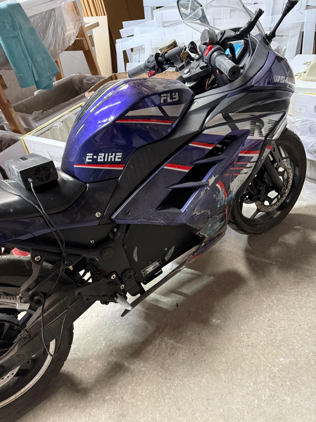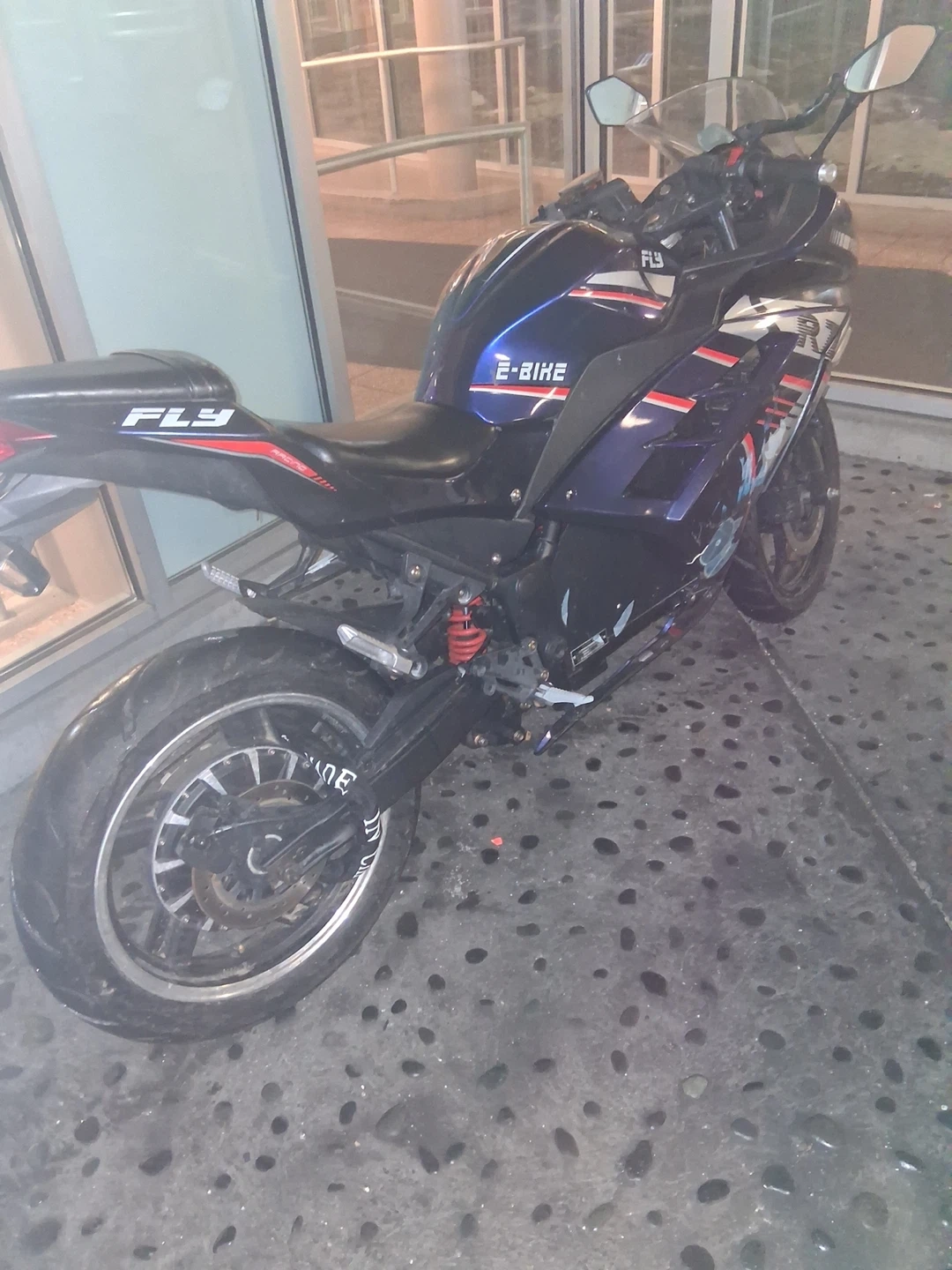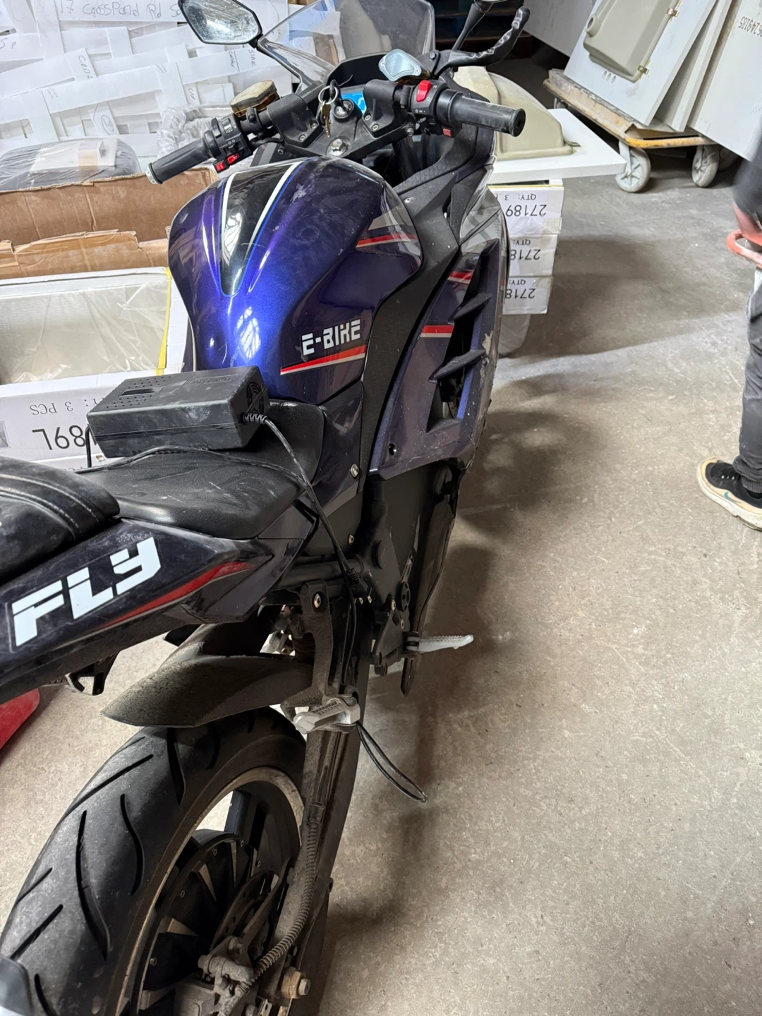 This is a FLY E-BIKE motorcycle. It's electric and features a stylish design. Its sleek frame and electric motor make it a modern way to get around!