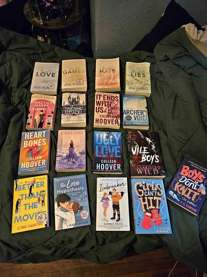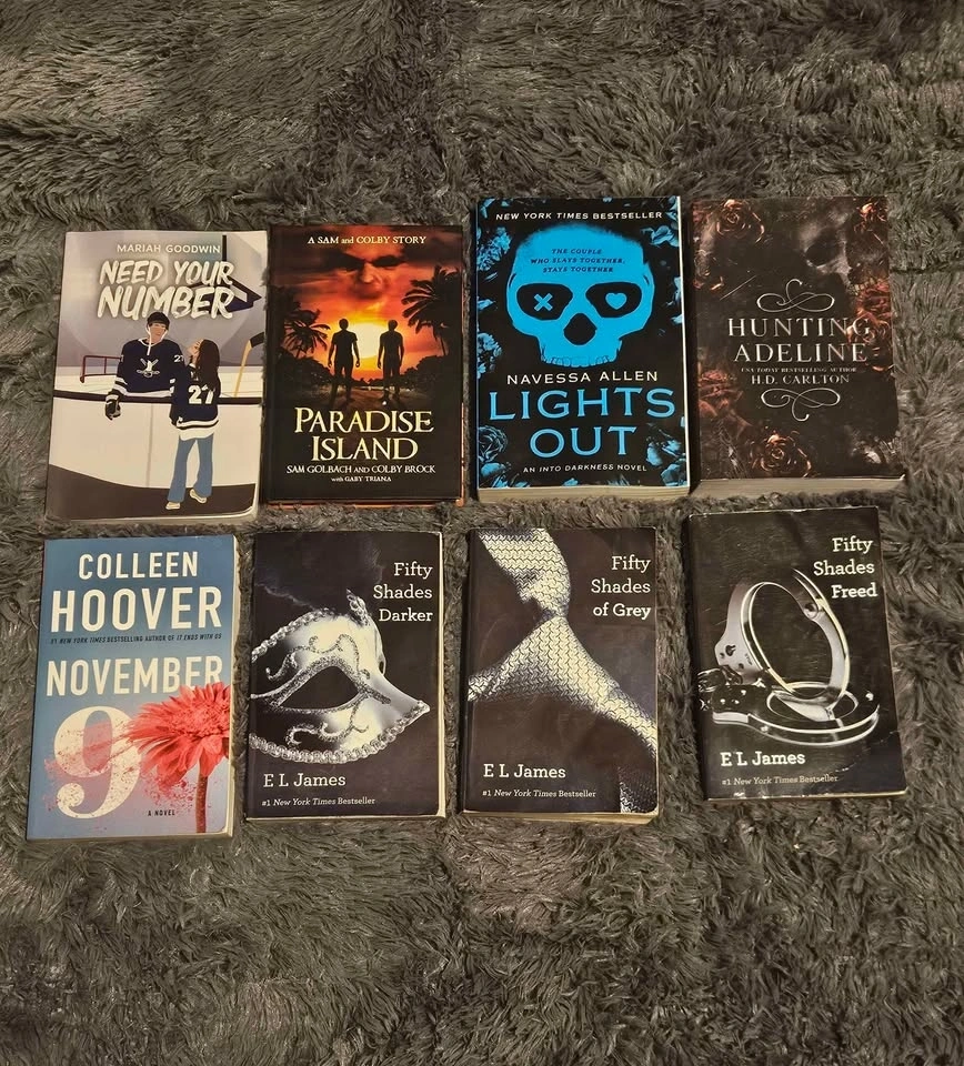 Some books are brand new and some have been read once but are still in great condition. Available books include: Twisted Love, Twisted Games, Twisted Hate, It Ends With Us, A Thousand Heartbeats, The Fine Print, Need Your Number, Paradise Island, Lights Out, Hunting Adeline, November 9, Fifty Shades of Grey, Fifty Shades Darker, and Fifty Shades Freed. Feel free to message if you have any questions!