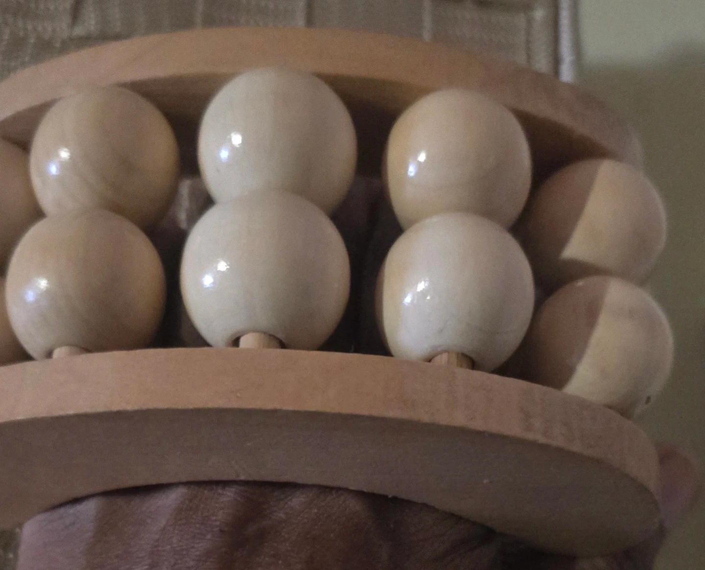 🥕This is a wooden roller massager with smooth, light-colored wooden beads. It's designed to roll along the contours of the body for a soothing massage. The natural wood construction feels sturdy and durable. It's great for targeting muscle tension after a long day!