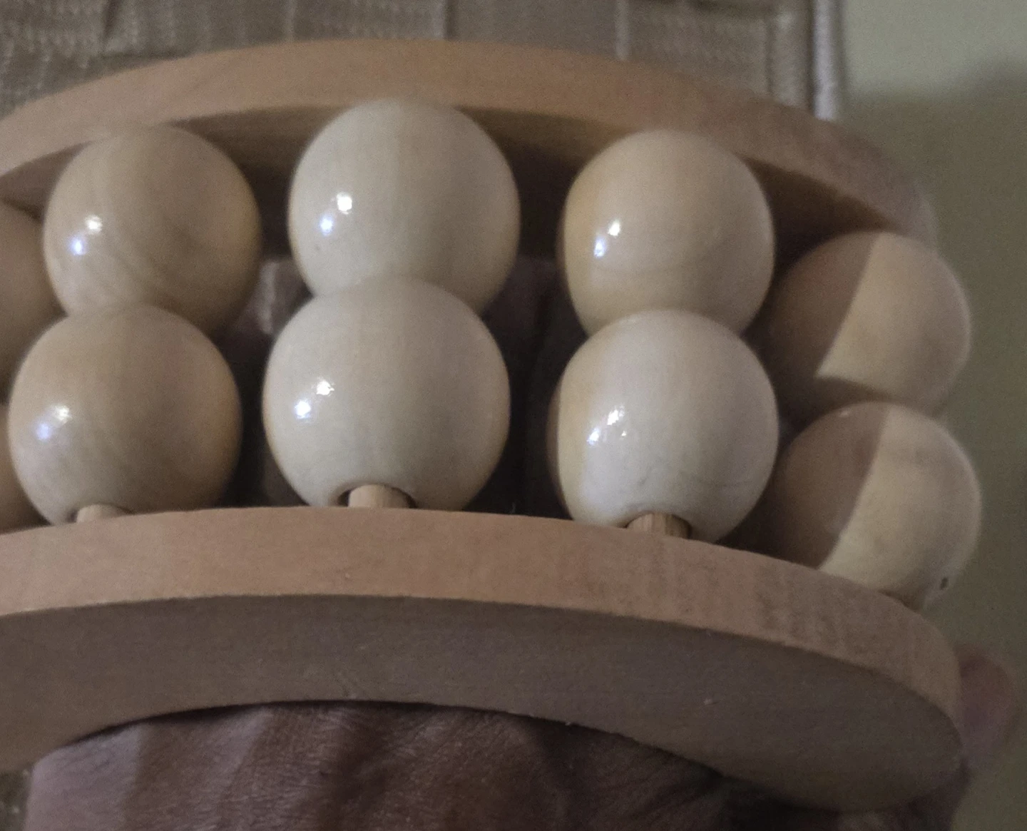 🥕This is a wooden roller massager with smooth, light-colored wooden beads. It's designed to roll along the contours of the body for a soothing massage. The natural wood construction feels sturdy and durable. It's great for targeting muscle tension after a long day!