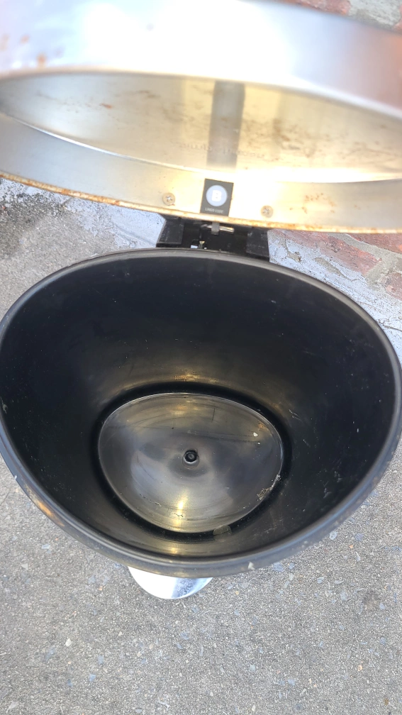 Small step trash can. Stainless steel exterior, black interior. Stainless Steel Trash disposal,can hold probably 3 gallon, No wear and no tear,dark brown color