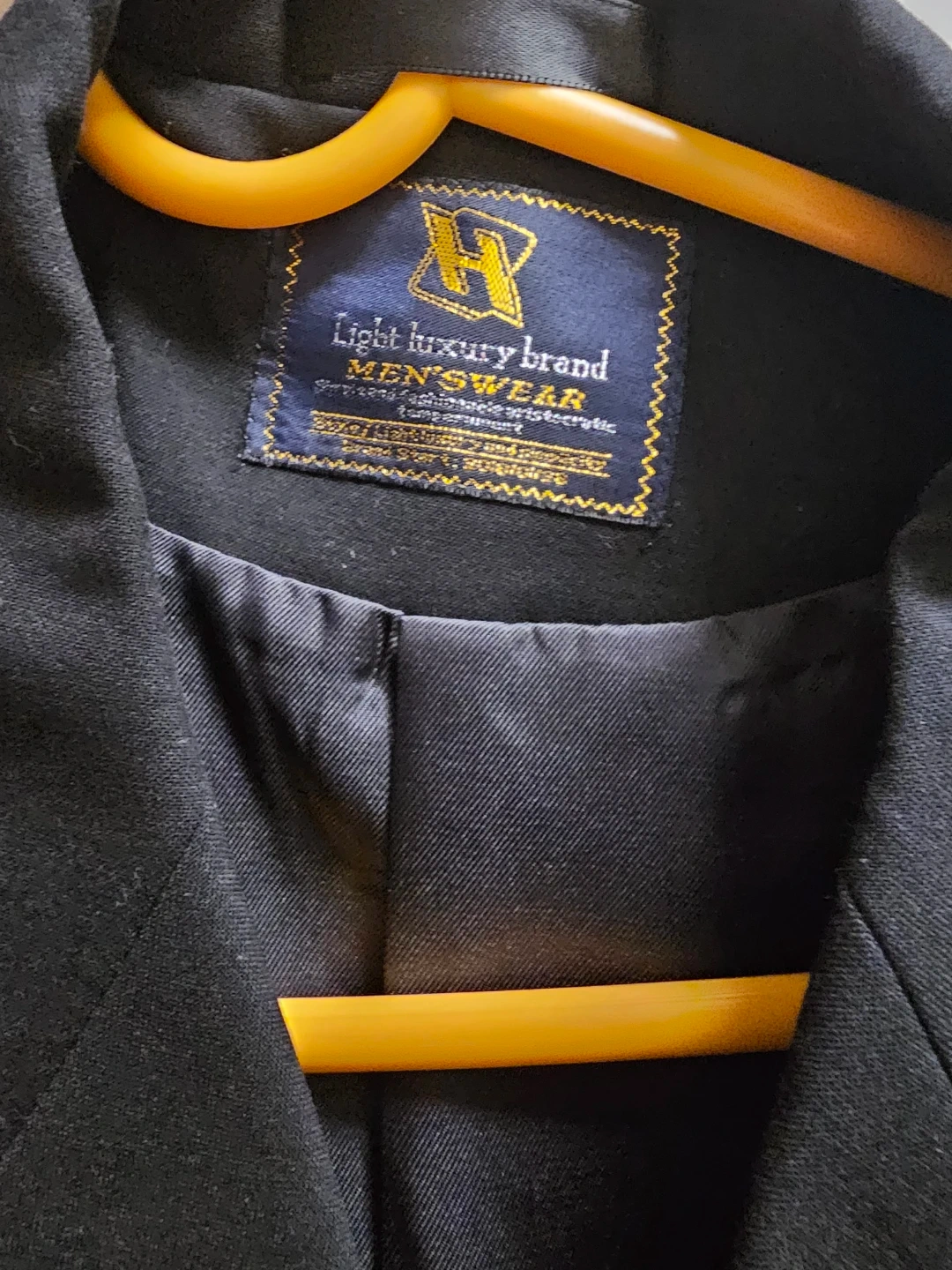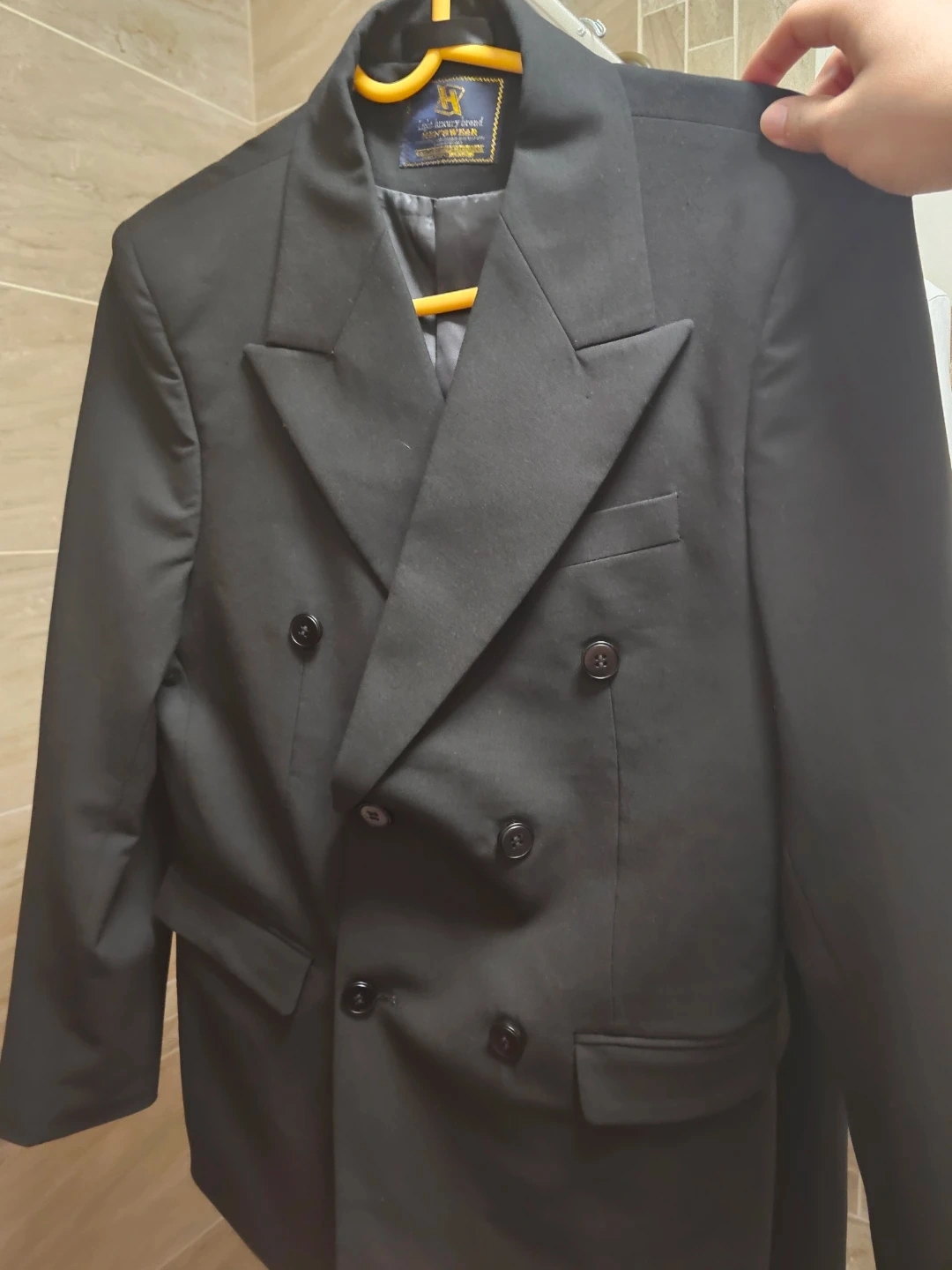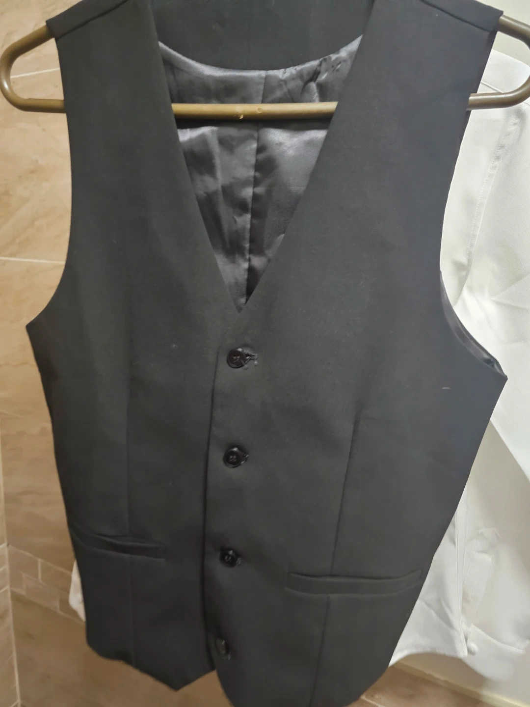 This is a 4-piece men's suit set. It includes a black double-breasted blazer, a black vest, black trousers, and a white dress shirt. The blazer is from the brand Light Luxury Brand Menswear. Open to offers and trades.