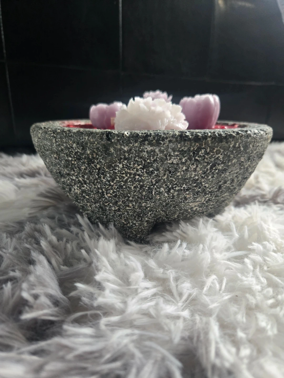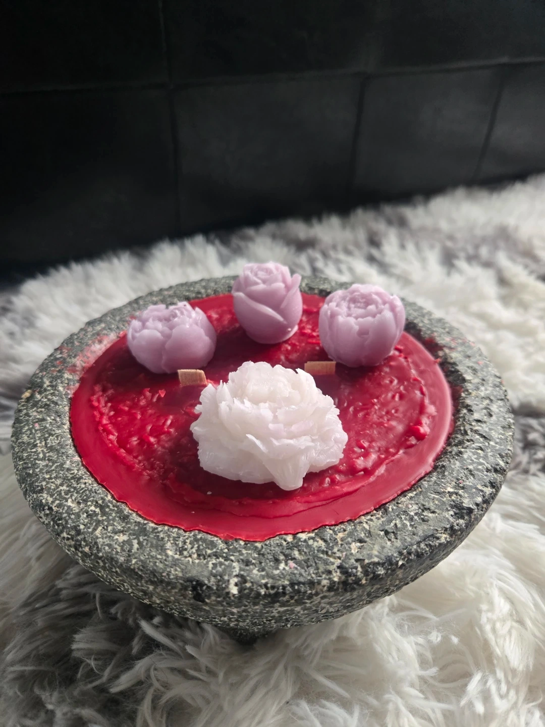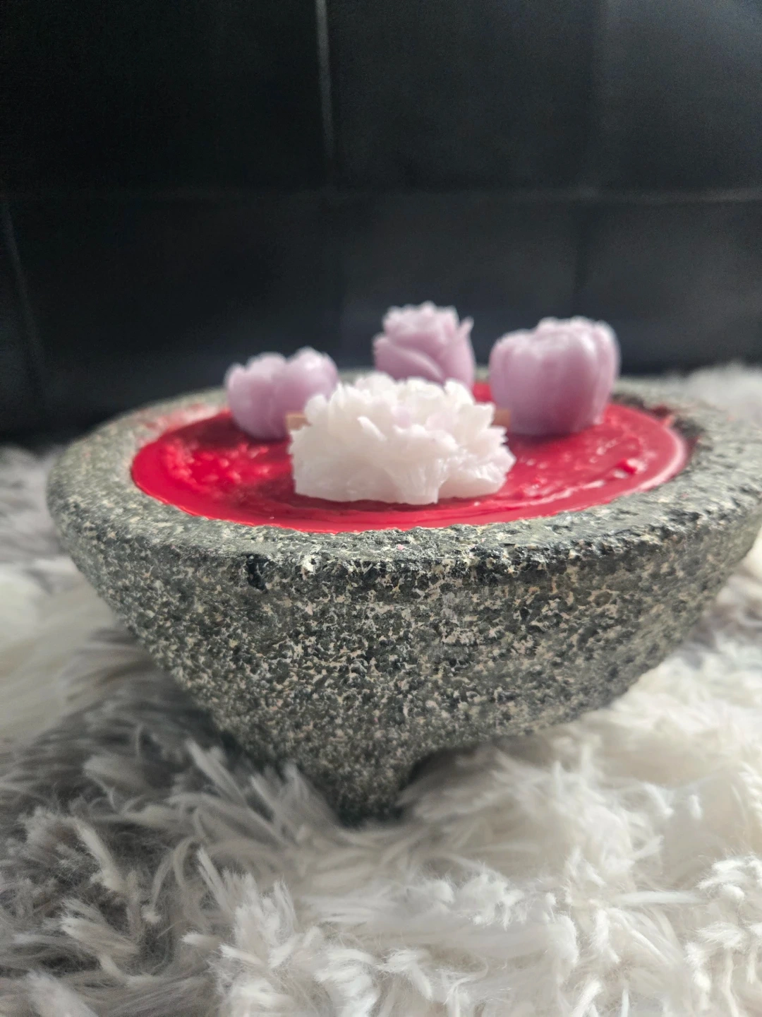 Decorative candle featuring a unique stone mortar bowl base. It's filled with red wax and topped with floral-shaped wax melts. The rustic bowl and decorative accents make it a charming piece!