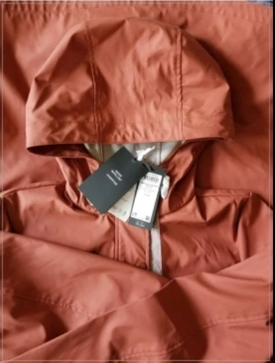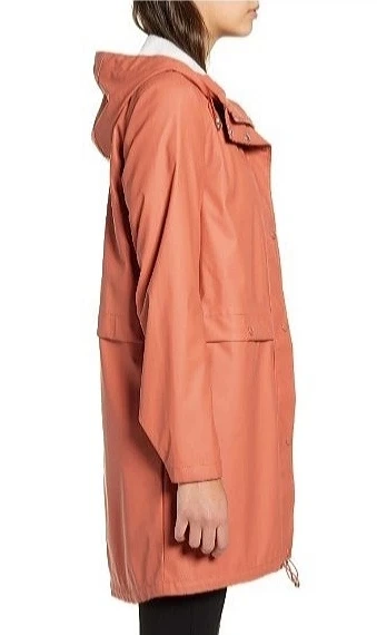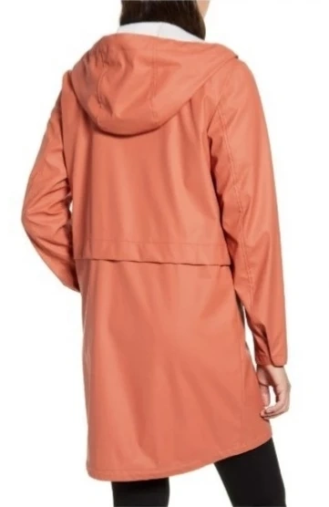 Waterproof rain coat in a Bruschetta/coral color. Features a hood and adjustable drawstring waist. Made from durable material.