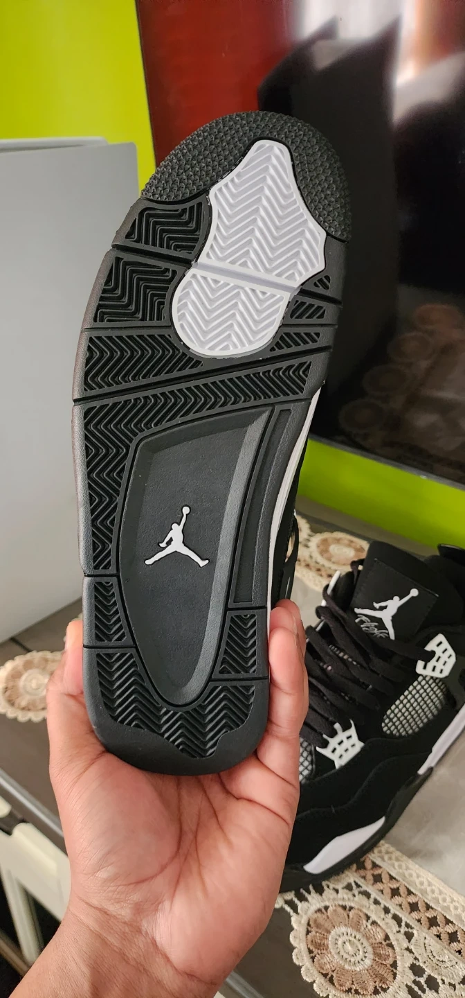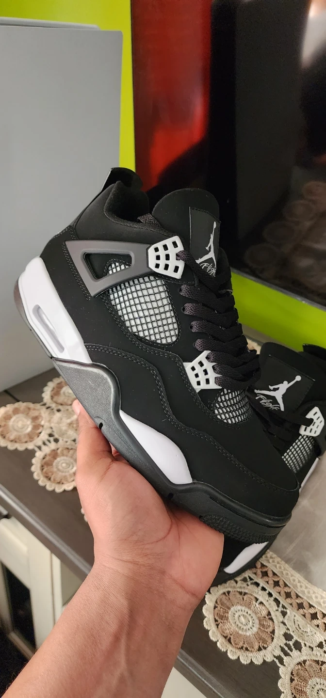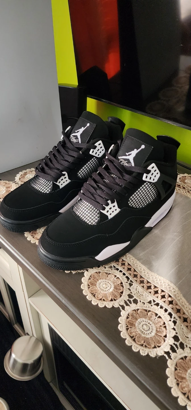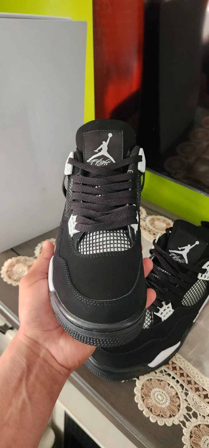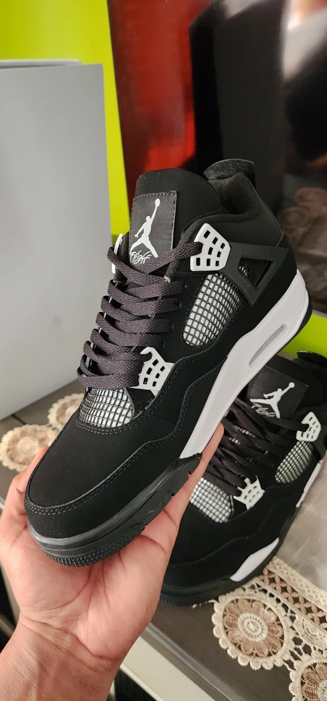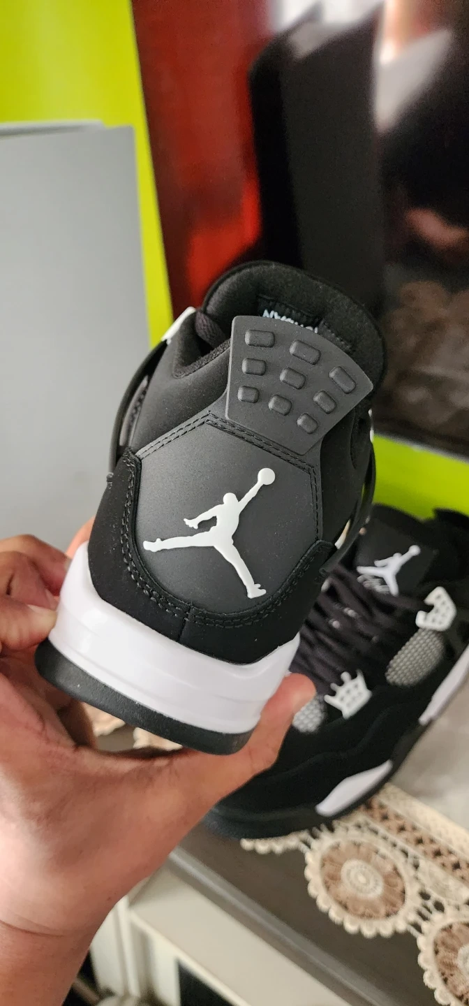 These Air Jordan 4 sneakers come in a classic black and white colorway. They feature the iconic Jumpman logo on the tongue and heel. Durable rubber sole with great traction.