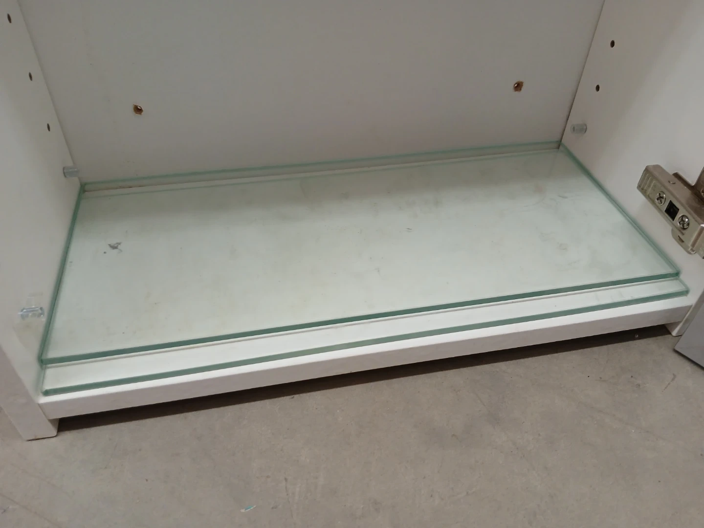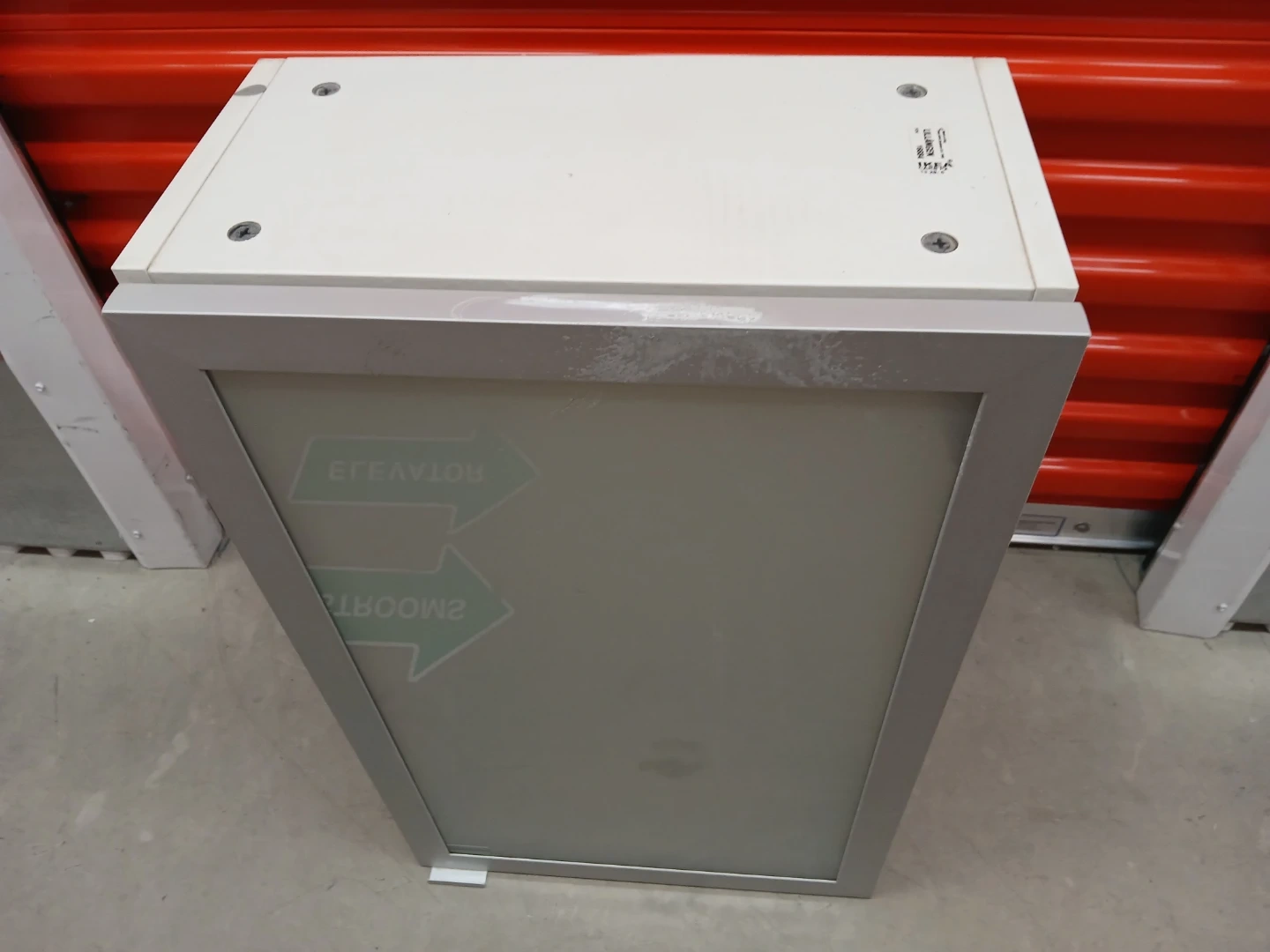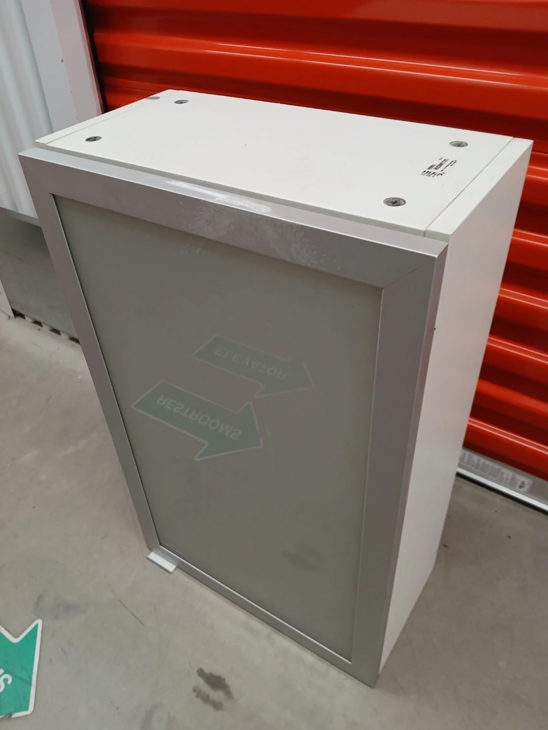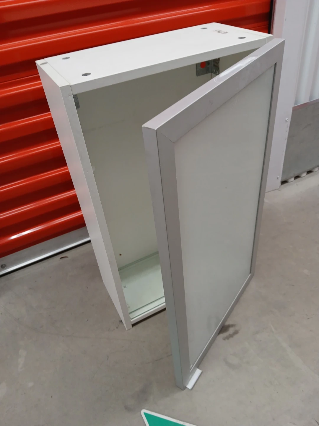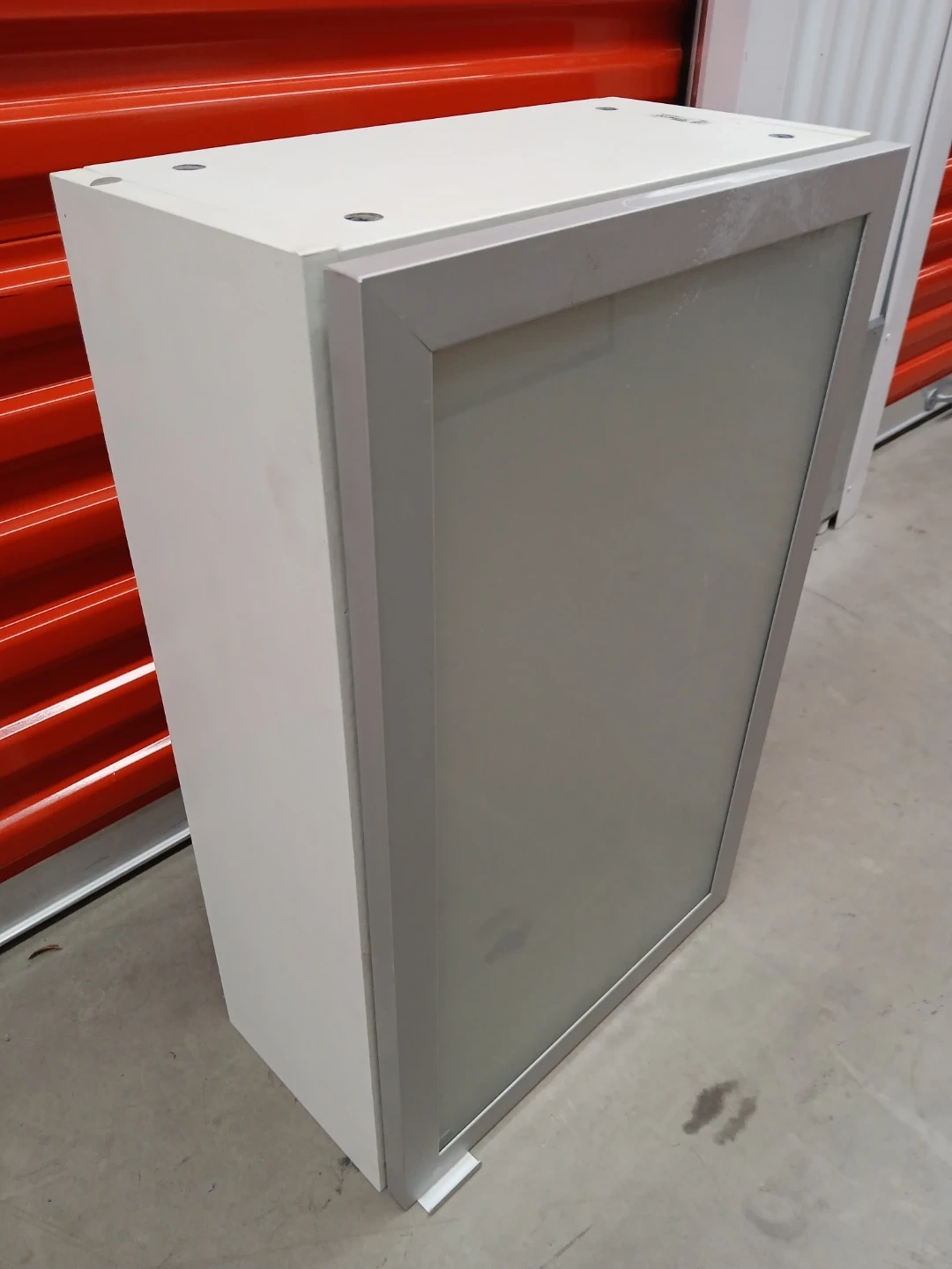 This is a white medicine cabinet with a frosted glass door. It has a silver-tone frame around the door. The interior is white with a glass shelf. There's also some text on the glass door that says 'ELEVATOR' and 'ROOM'.