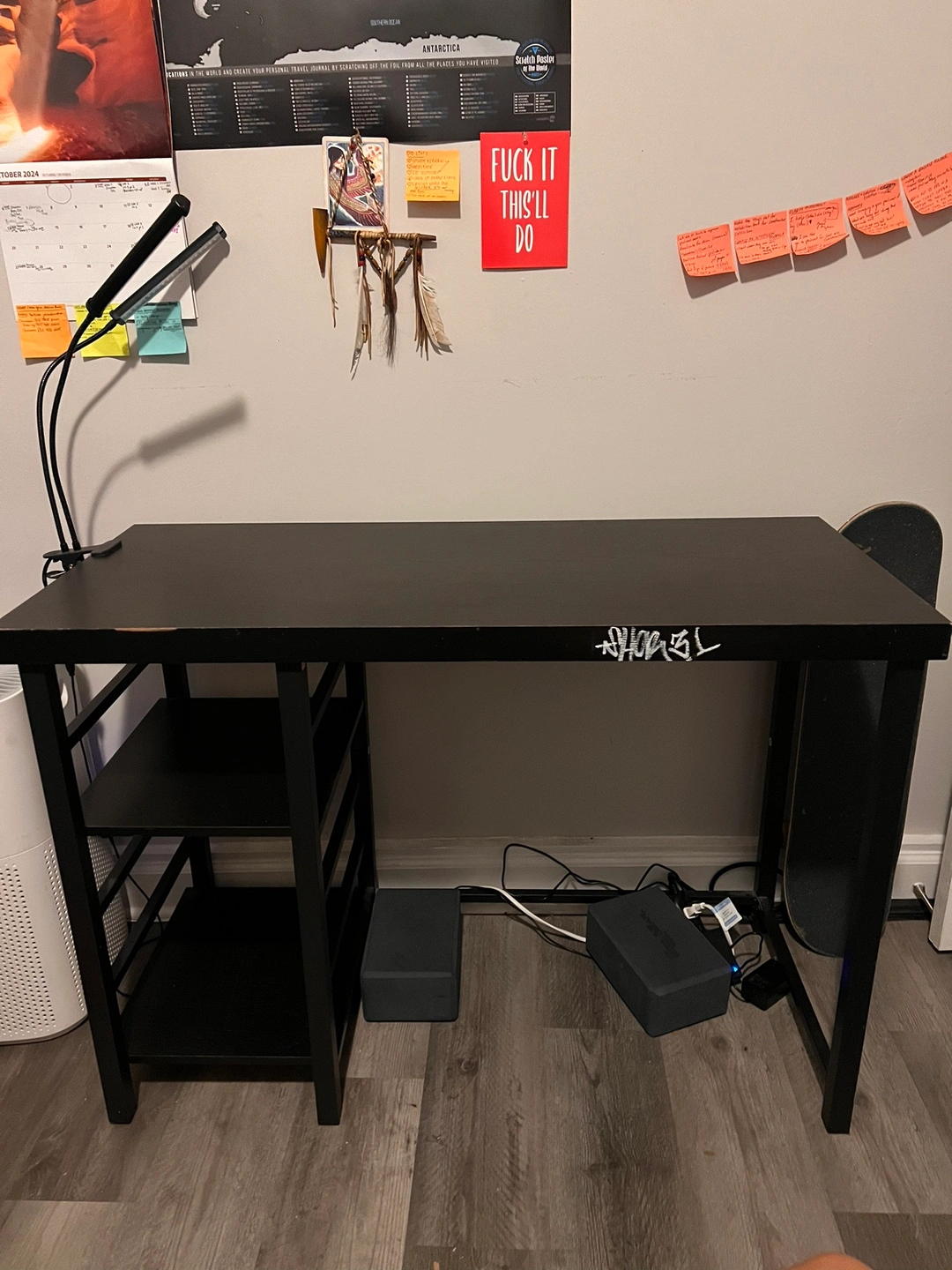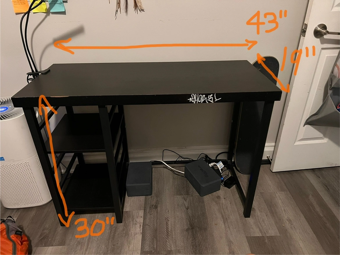 Black desk with a shelf, measuring 43" long, 30" tall, and 19" wide. Has a tag with white paint on the front but can be removed with cleaner. Has some scuffs, but it’s a perfect first time desk!