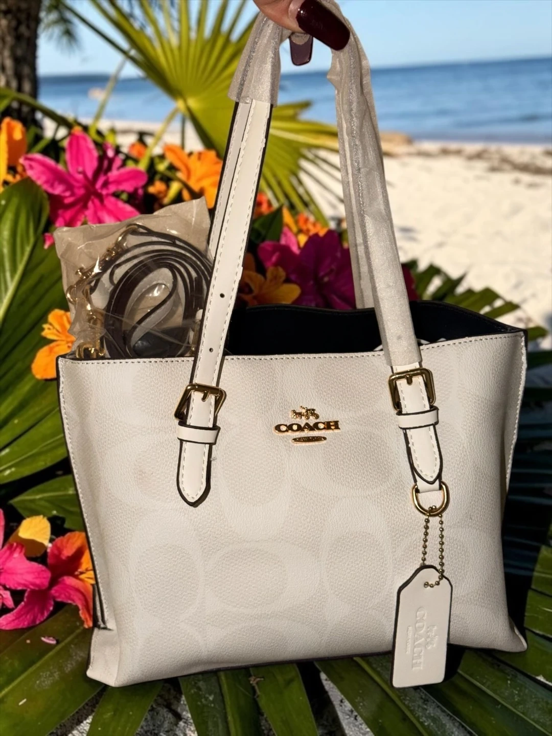 White Coach signature pattern tote bag. It has gold hardware and adjustable straps. Includes a crossbody strap and dust bag. Perfect for everyday use!