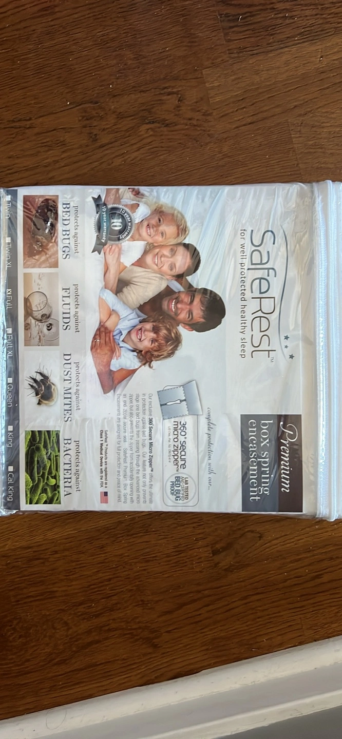 69I'm selling a SafeRest Premium Box Spring Encasement, size Queen. It's designed for well-protected, healthy sleep. This encasement is waterproof and provides a 10-year warranty. It protects against allergens, bed bugs, dust mites, and bacteria. Features include a 360° Secure Micro Zipper and is machine washable and tumble dry low heat