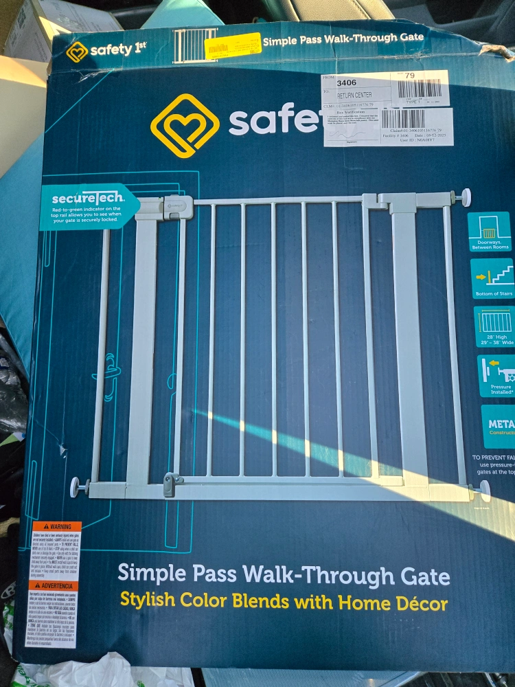 10Selling a Safety 1st Simple Pass Walk-Through Gate! It has a securetech red-to-green indicator. It's 28" high and 29"-38" wide and pressure installed! Stylish color blends with home decor