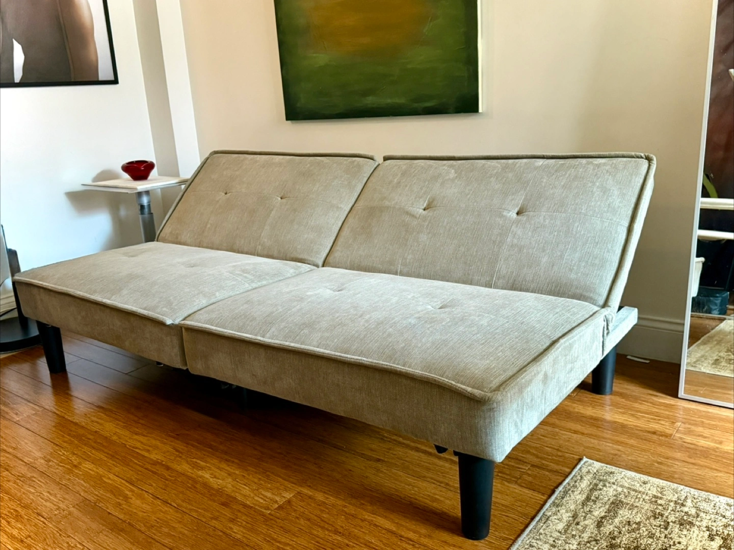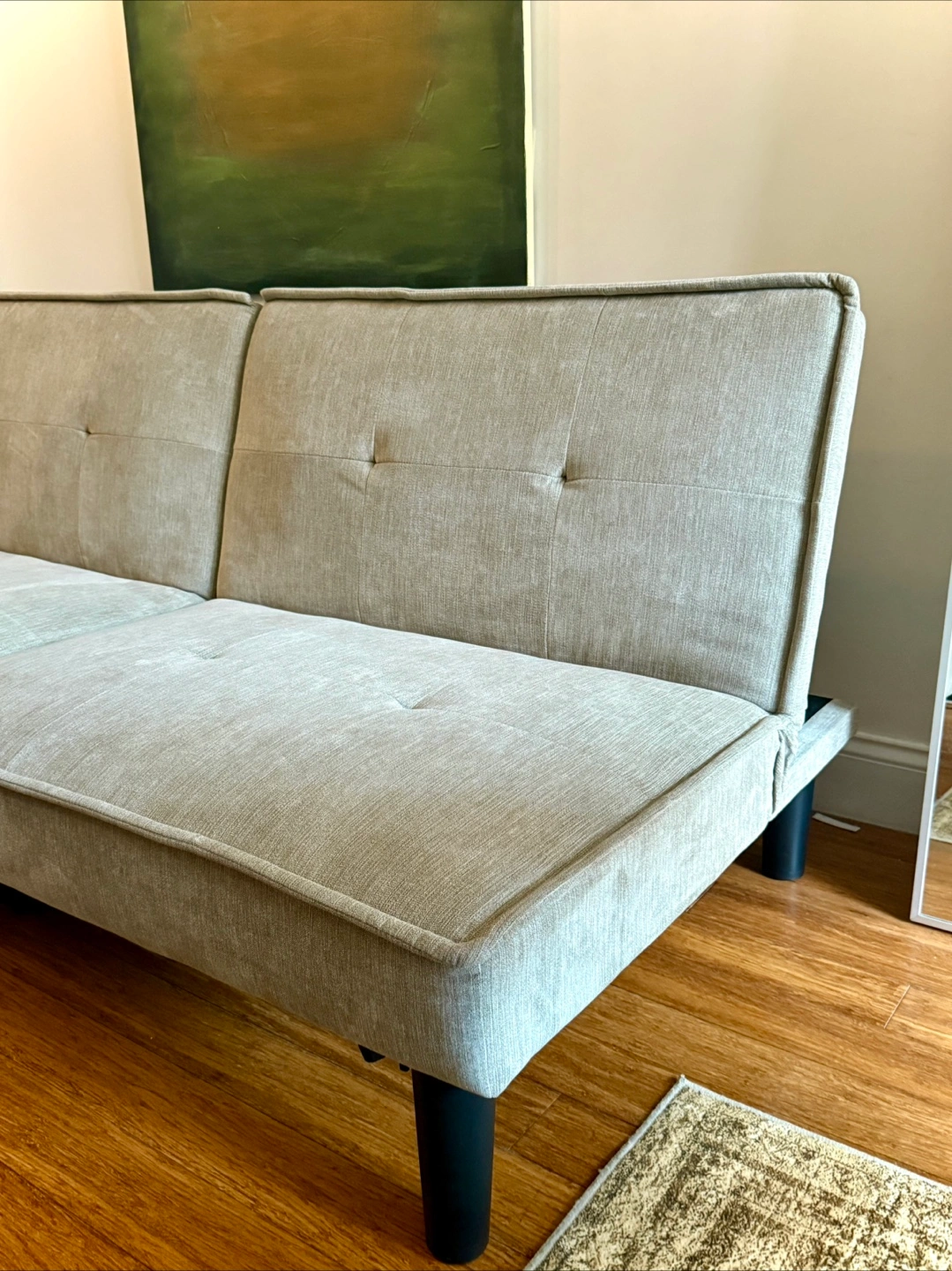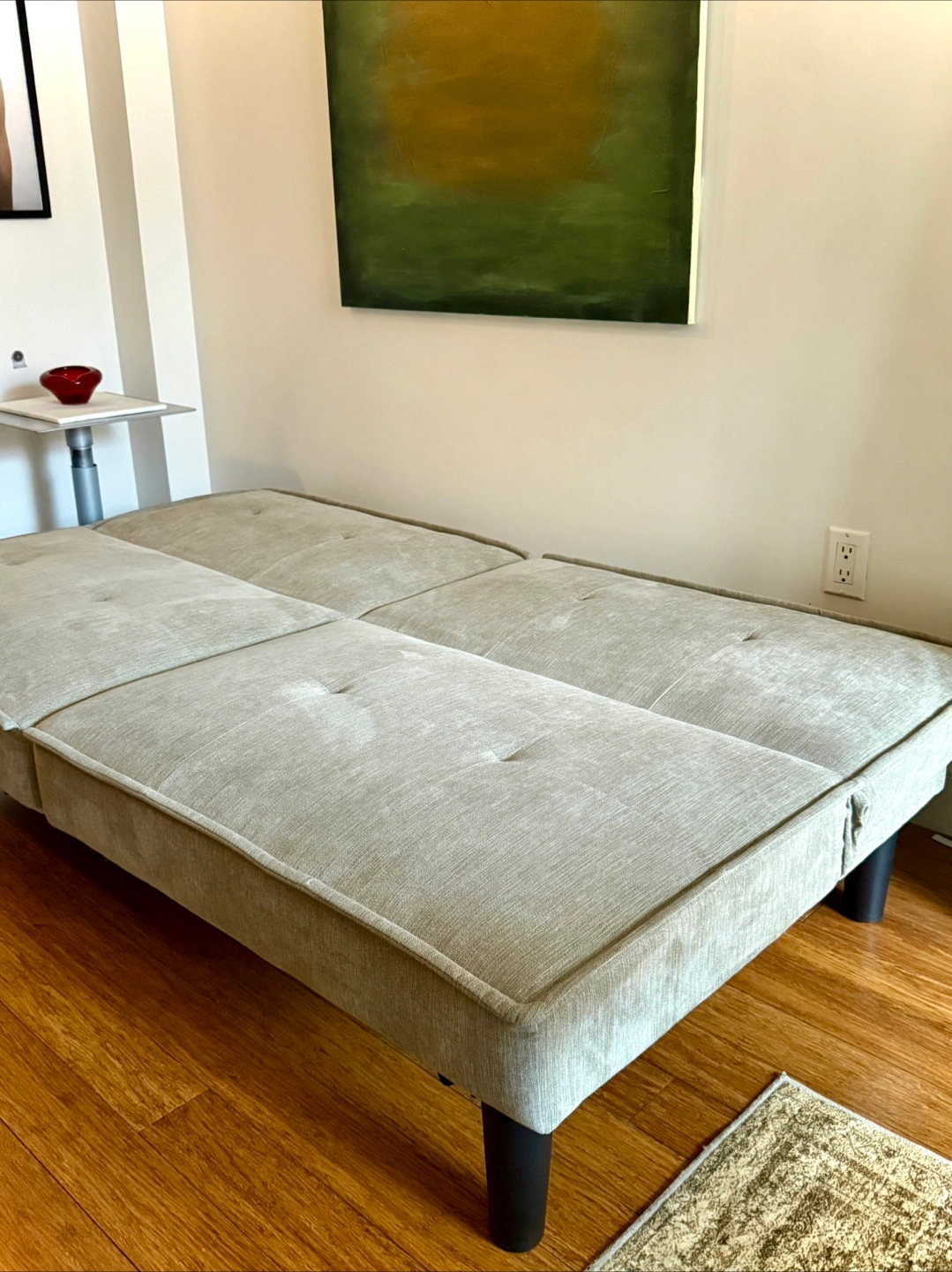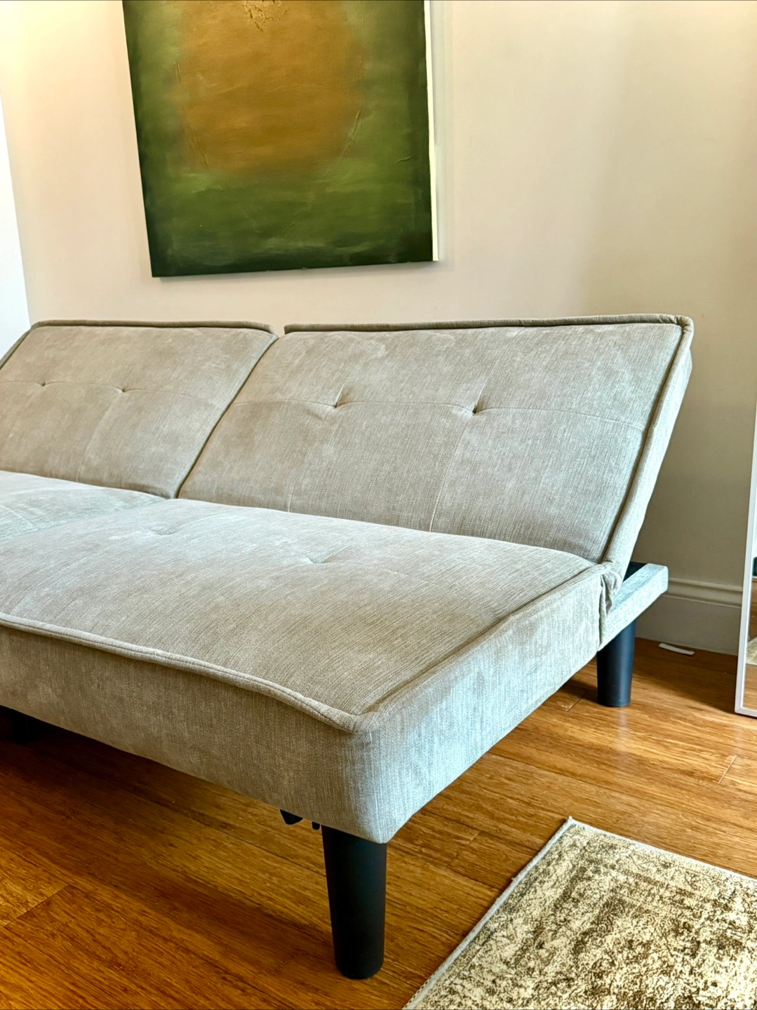 65Selling a sage futon sofa bed. It's in good condition and would be great for a living room or guest room. The futon can be easily converted into a bed, making it perfect for accommodating guests. The neutral color will match any decor. Upholstery in excellent condition, was protected by a slipcover since day 1.