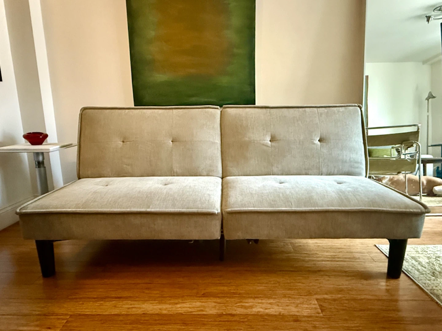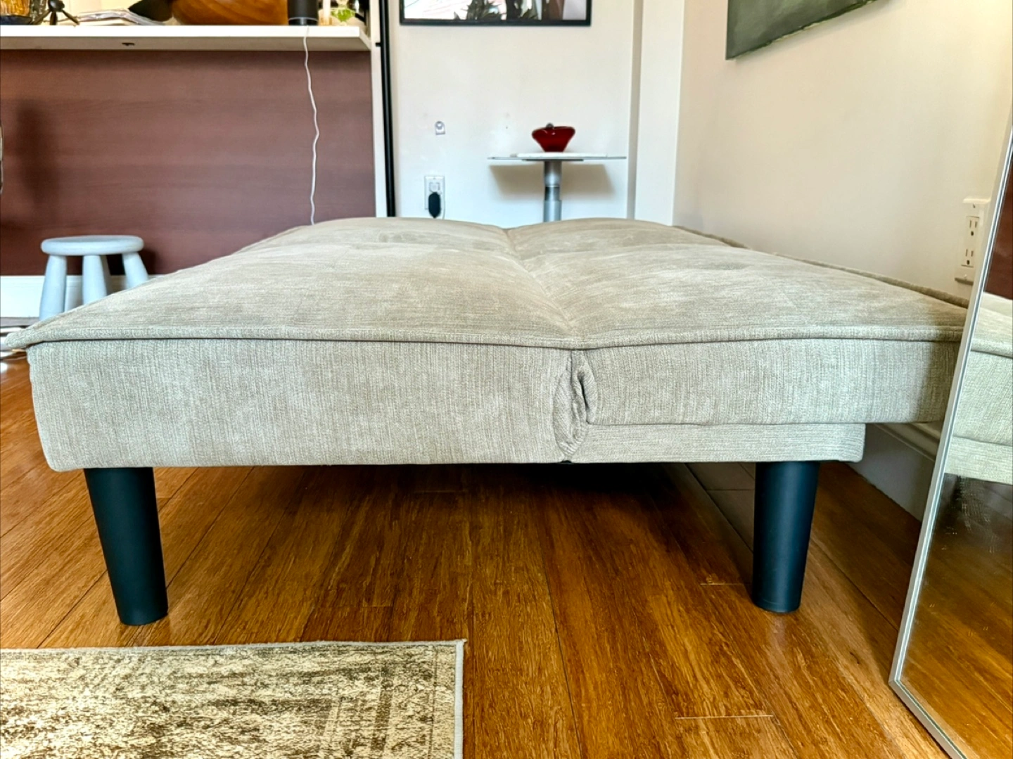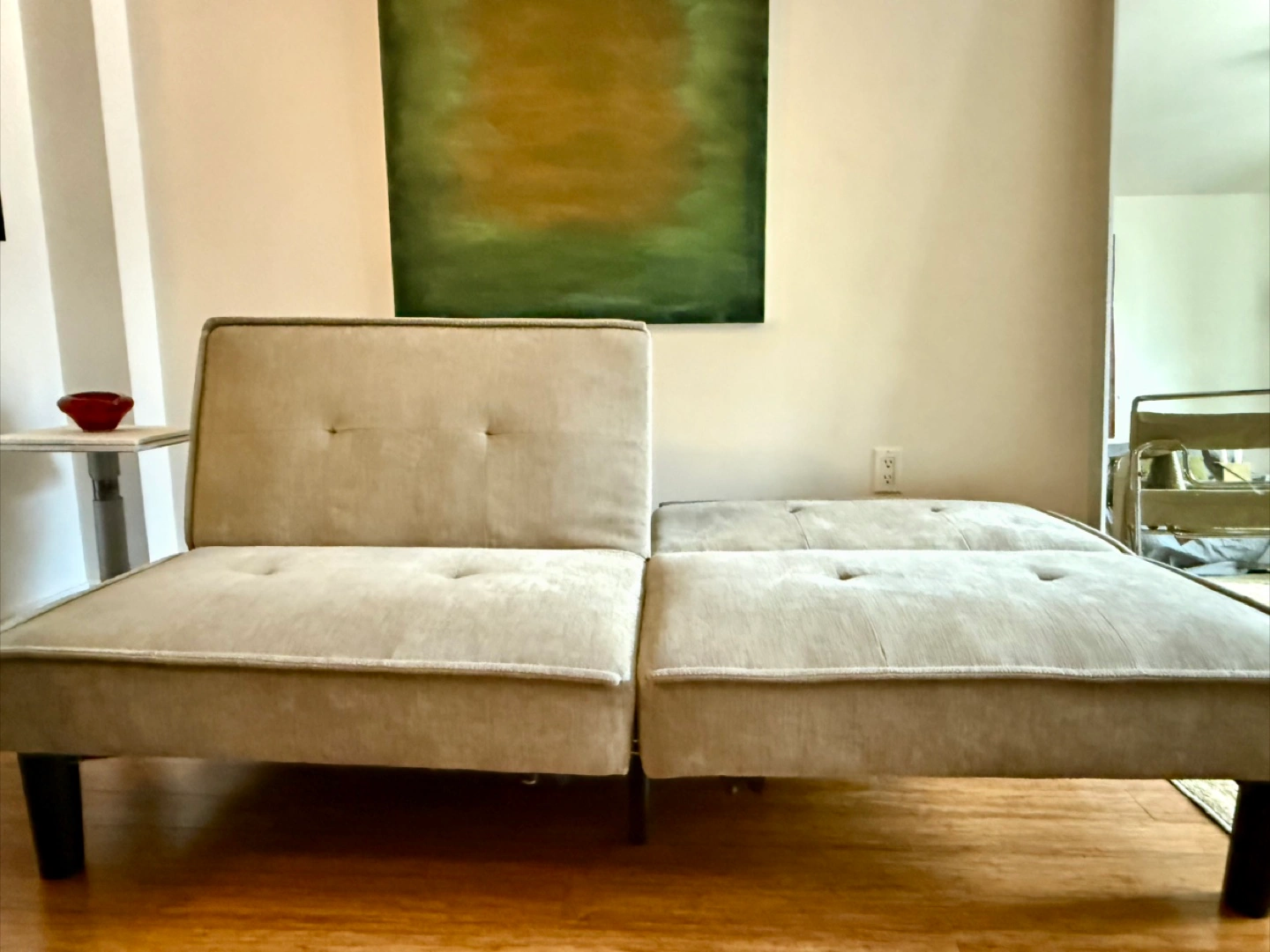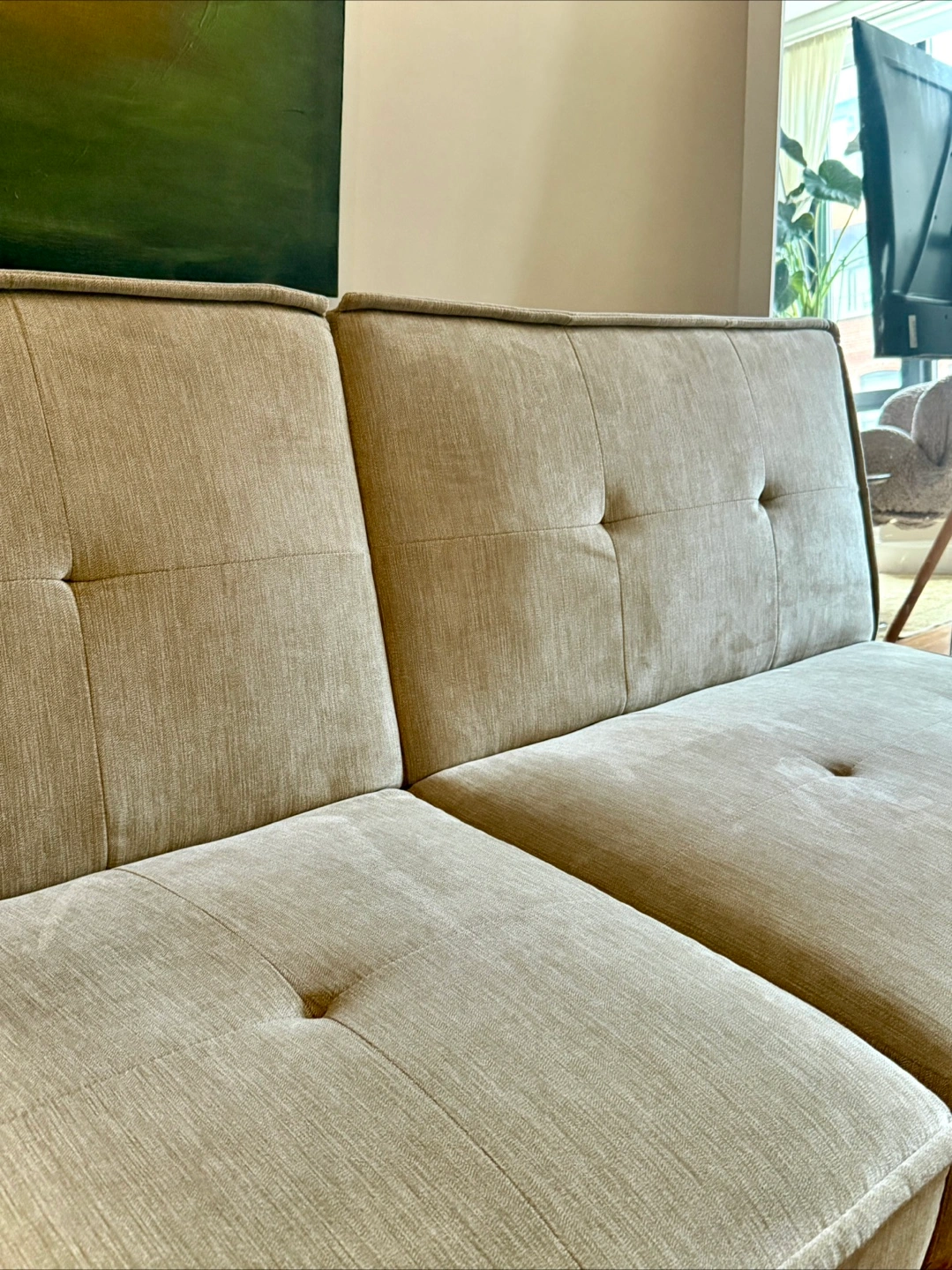 65Selling a sage futon sofa bed. It's in good condition and would be great for a living room or guest room. The futon can be easily converted into a bed, making it perfect for accommodating guests. The neutral color will match any decor. Upholstery in excellent condition, was protected by a slipcover since day 1.
