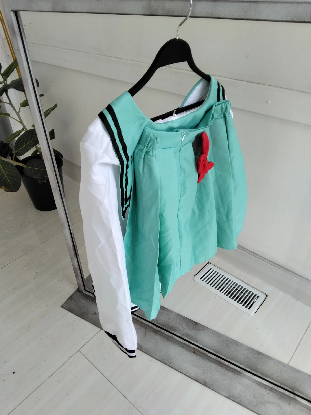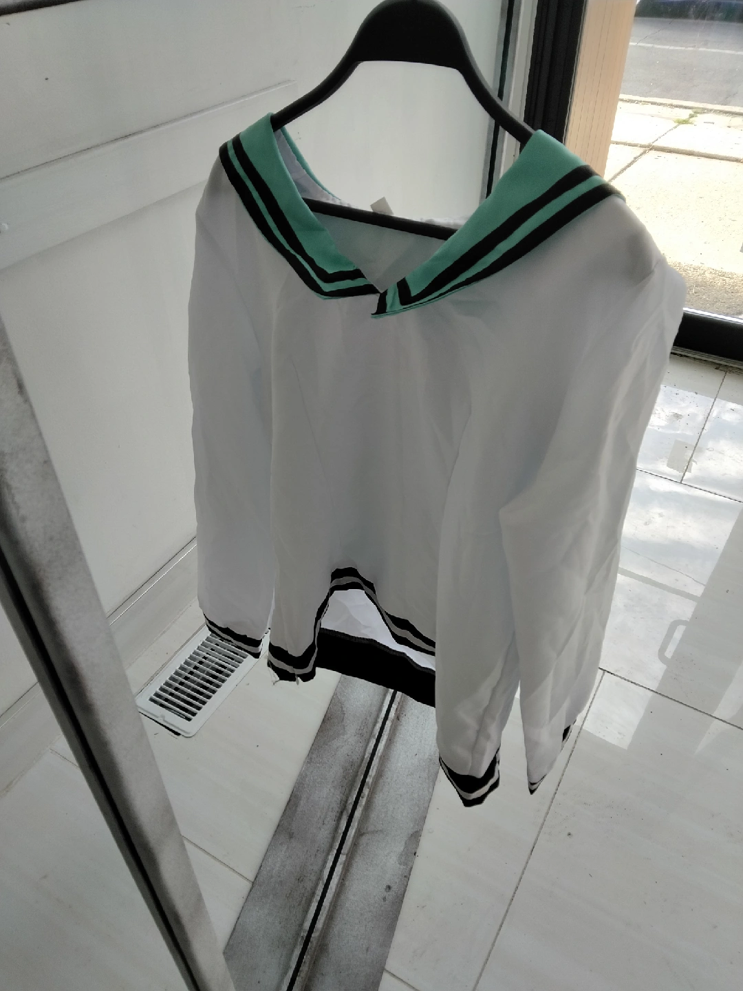 16Selling a sailor outfit in size XL. The outfit is white, light blue, and black with a red bow. It looks to be in good condition! May fit Large to XL