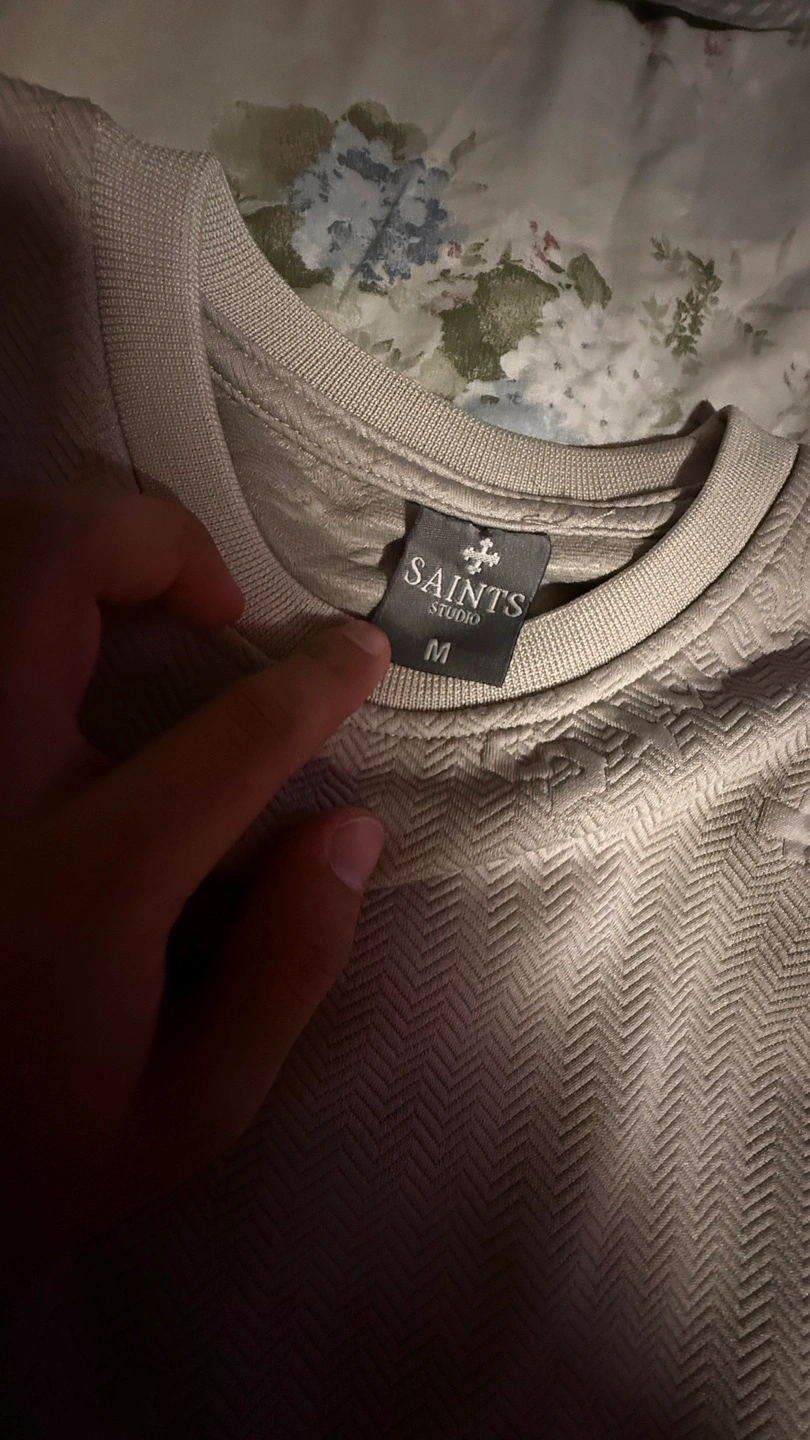 Selling a beige t-shirt from Saints Studio in size medium. The shirt features a unique textured pattern throughout. In great condition like brand new and ready for a new owner.