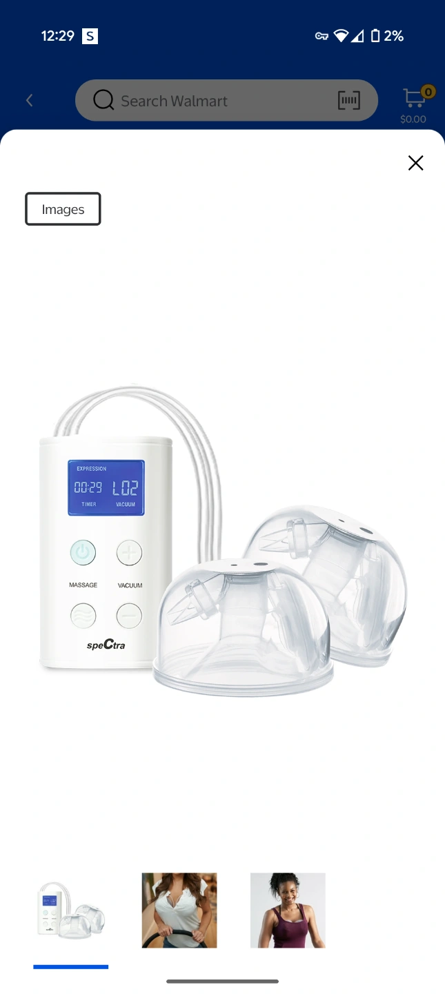 Double electric breast pump. Includes two pump attachments. Digital display shows time and vacuum level. Massage and vacuum settings.