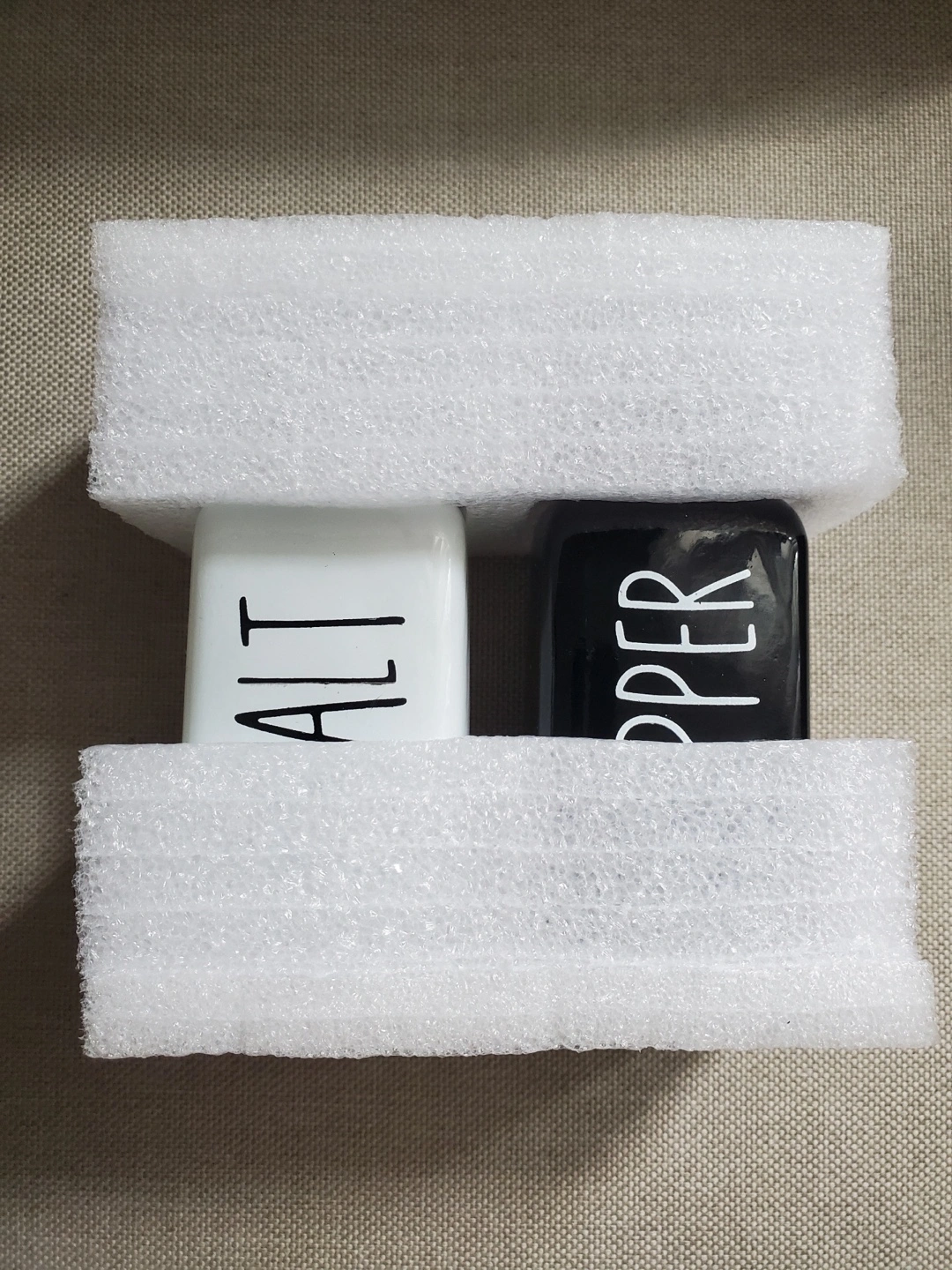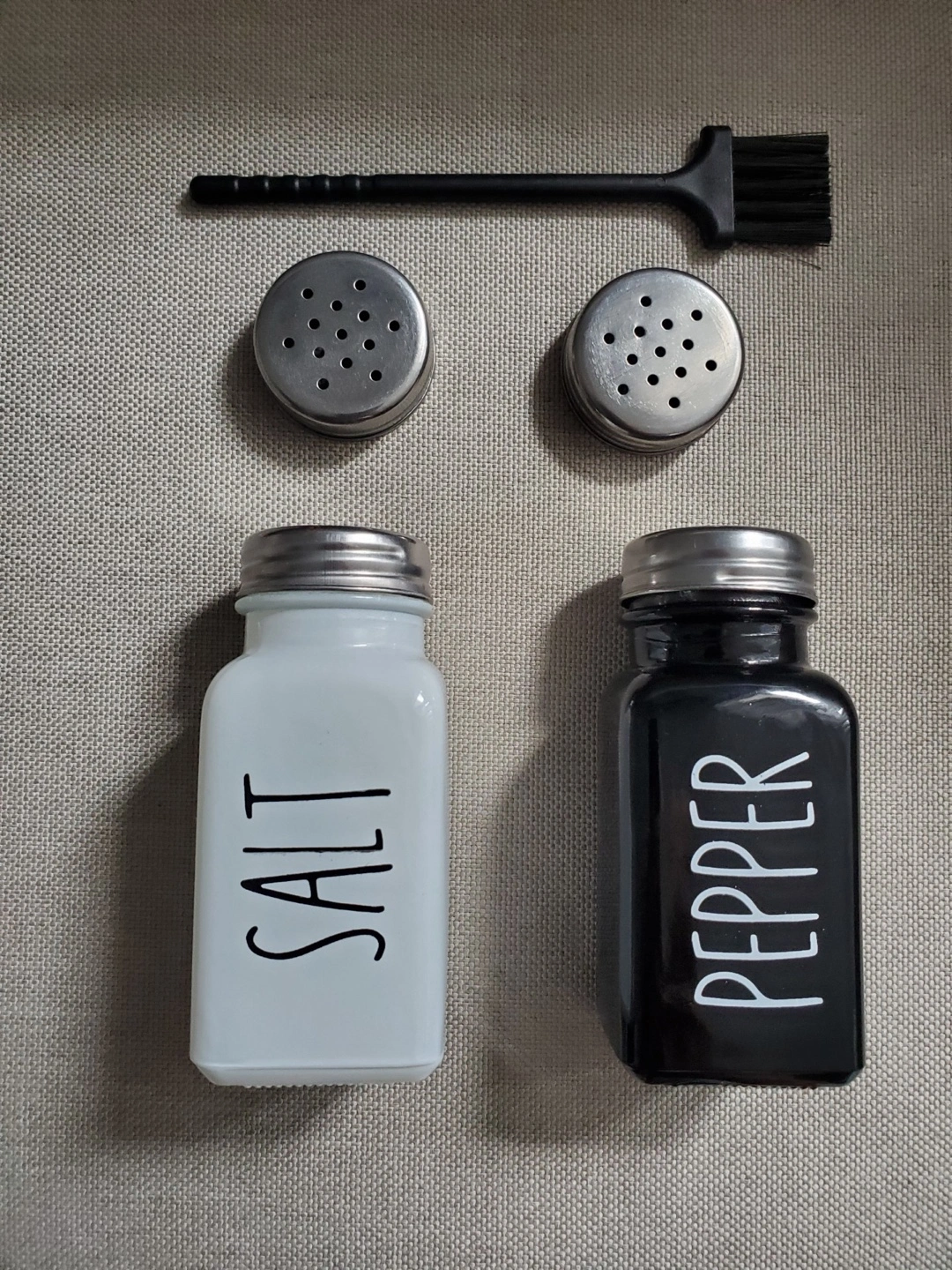 Cute salt and pepper shakers. Black and white glass. Extra metal lids with holes. Includes small cleaning brush.