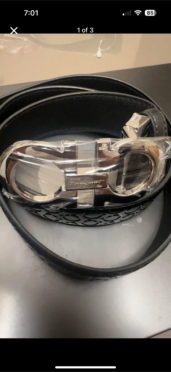 Selling a Salvatore Ferragamo black leather belt! It features a stylish buckle and a patterned leather strap, making it a fashionable accessory for any outfit