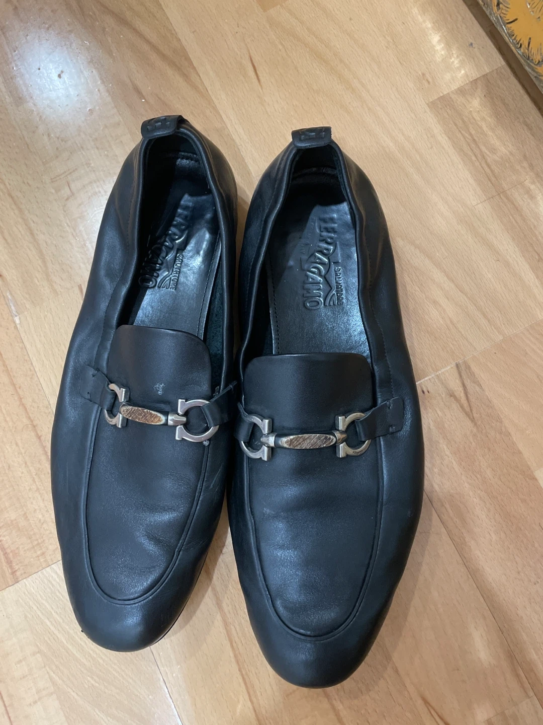 Here are some Salvatore Ferragamo black leather loafers. They feature the iconic Salvatore Ferragamo logo on the front strap. These are a stylish and comfortable addition to any wardrobe!