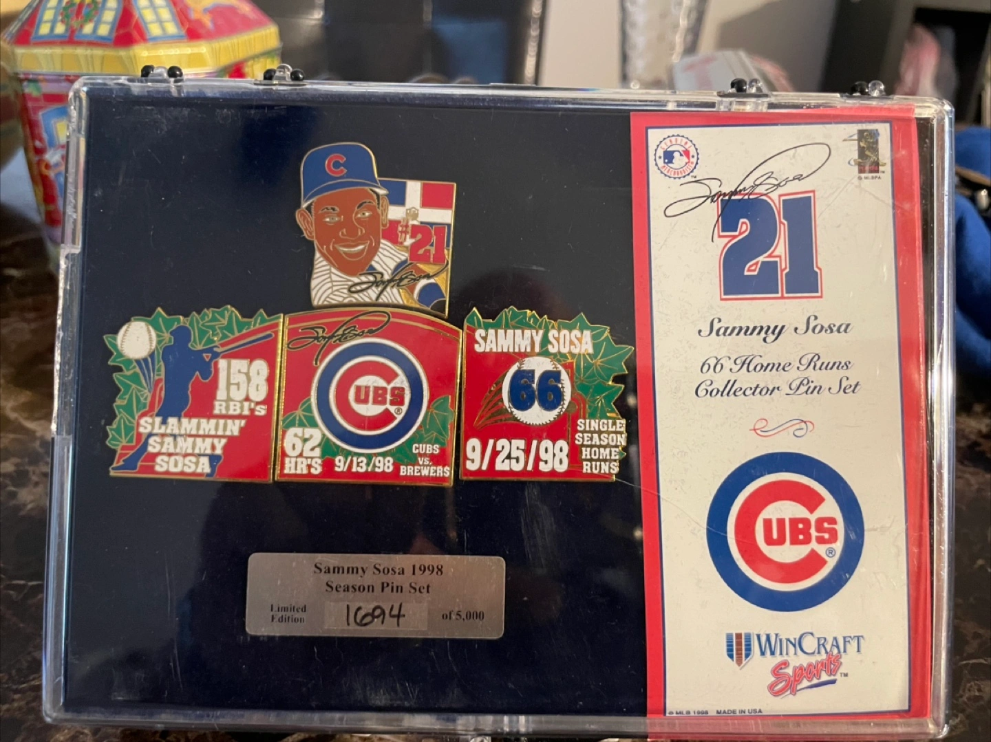 154I have a Sammy Sosa 66 Home Runs Collector Pin Set and a Mark McGwire 70 Home Runs Collector Pin Set for sale! Both are limited editions from Wincraft Sport. The Sammy Sosa set is numbered 1694 of 5,000, celebrating his 66 home runs in 1998. It includes pins commemorating his RBI's and home runs against the Brewers. The Mark McGwire set is numbered 3070 of 5,000, celebrating his 70 home runs. It also includes pins for his games and home runs records.