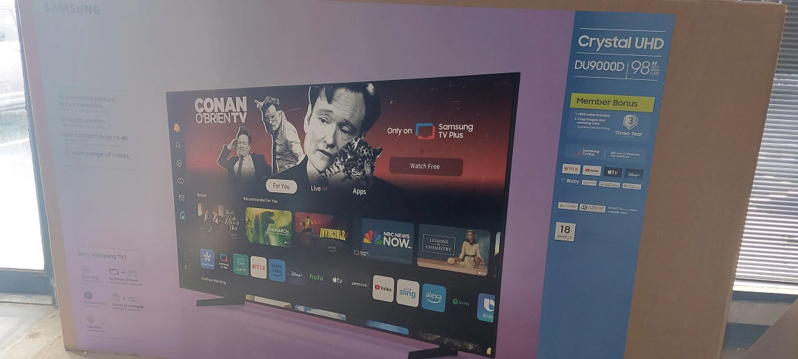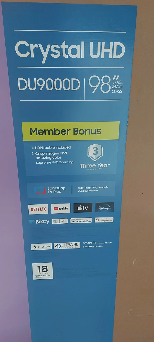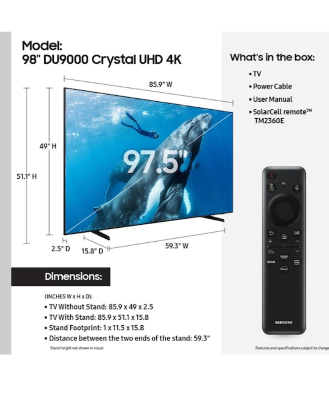 SAMSUNG 98” Class DU9000 Crystal UHD Smart TV UN98DU9000F Highlights UHD 4K 3840 x 2160 LED Panel HDR10+ & HLG Support Smart TV Powered by Tizen 60 Hz Native Refresh Rate Motion Xcelerator 120 Hz 3 x HDMI 2.1 & 2 x USB-A Inputs Wi-Fi, LAN & Two-Way Bluetooth Samsung SmartThings & Alexa Built-in SolarCell Voice Remote Control Included Samsung Game Bar NEW with Warranty EASY FINANCING AVAILABLE