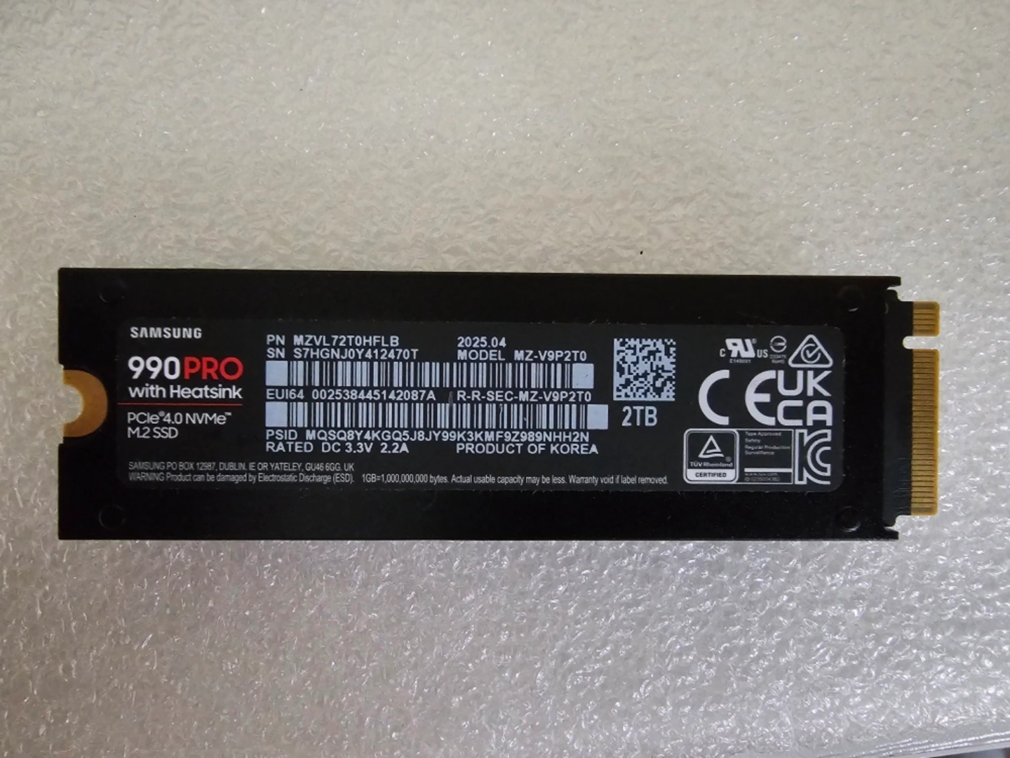 77Selling a Samsung 990 Pro 2TB SSD with Heatsink Key features: - PCIe 4.0 NVMe M.2 SSD - 2TB storage capacity Model: MZ-V9P2T0 Manufacturing Date: 2025 April 04