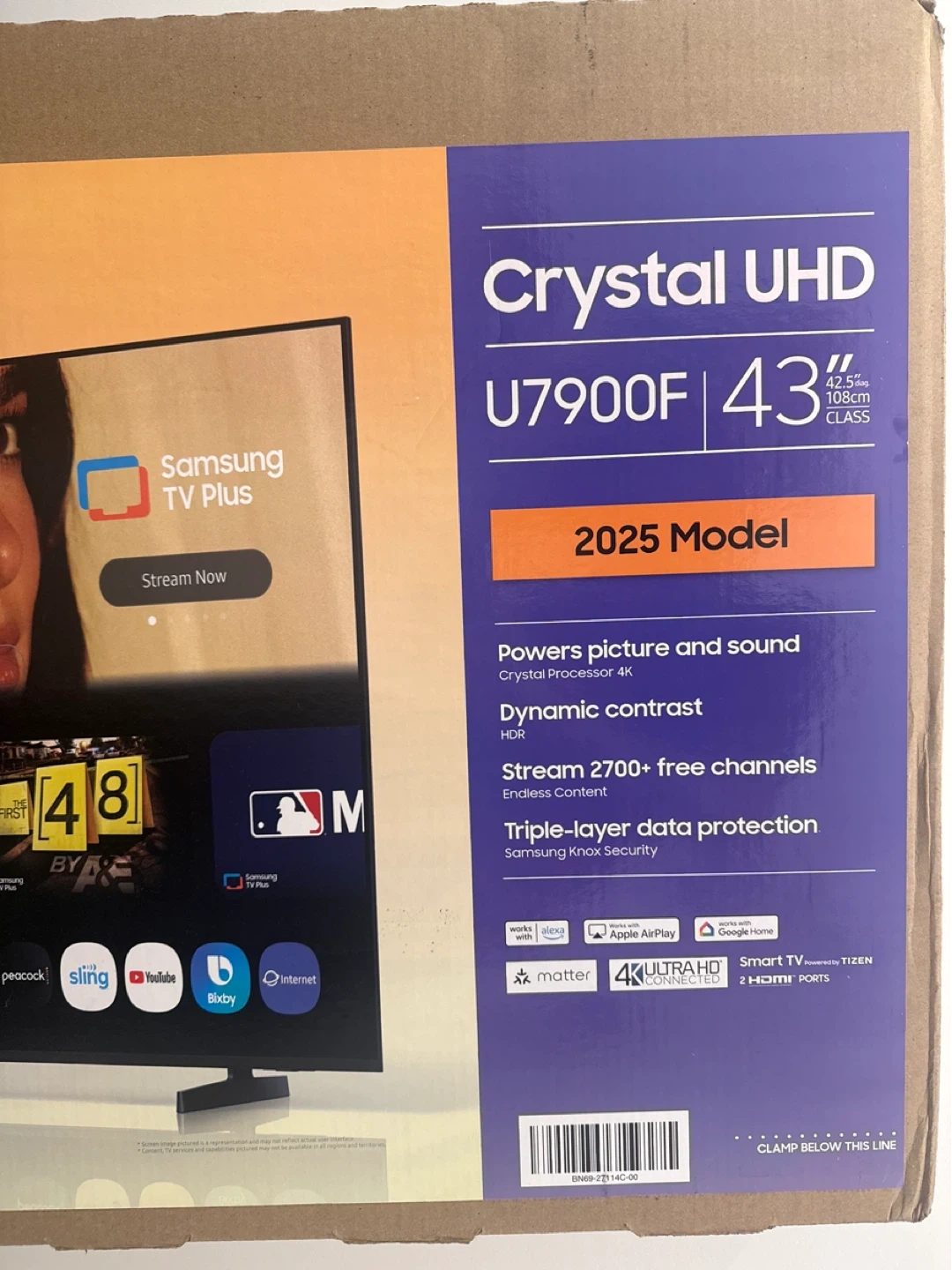 15Selling a Samsung Crystal UHD 43-inch TV, model U7900F. It's the 2025 model! The TV has Crystal Processor 4K, dynamic contrast, and streams over 2700 free channels. It also features triple-layer data protection with Samsung Knox Security. Works with Apple AirPlay and Google Home.