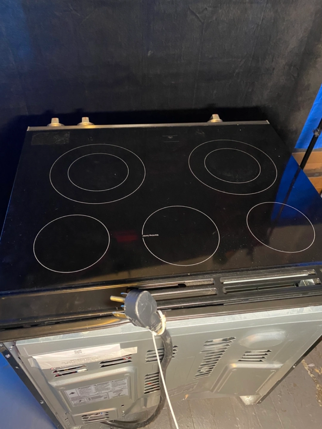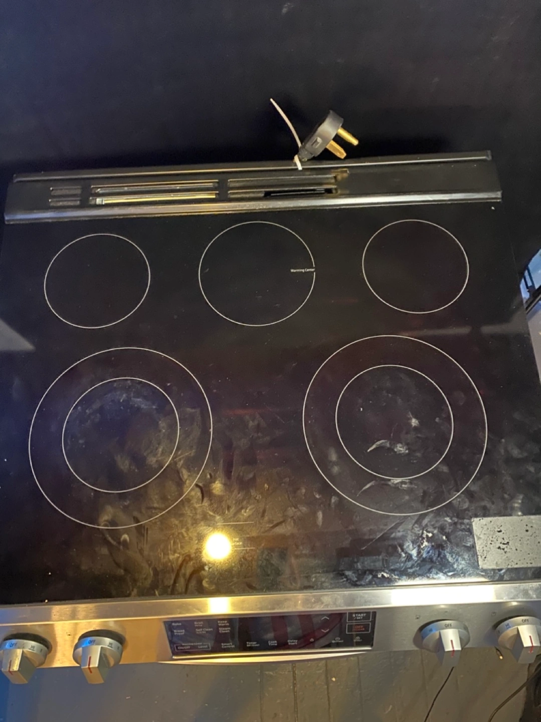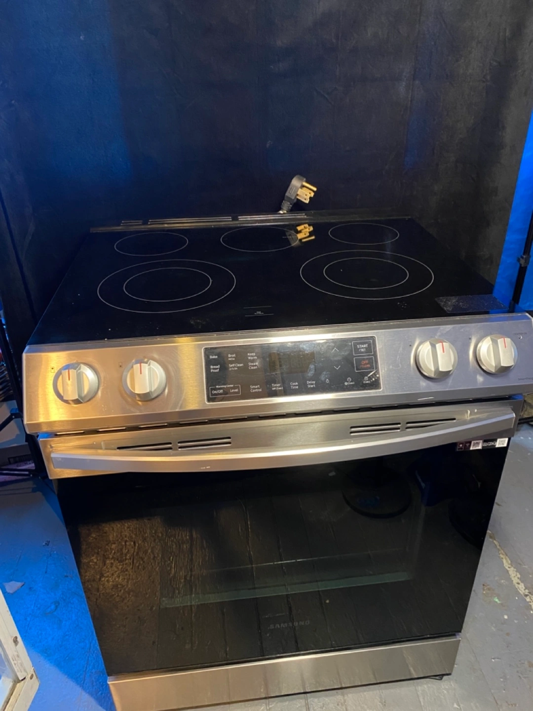 Selling a Samsung electric range. It has a black cooktop and a stainless steel finish. The back is a bit dented in and the left knob is loose but still turns. Knob covers for free!